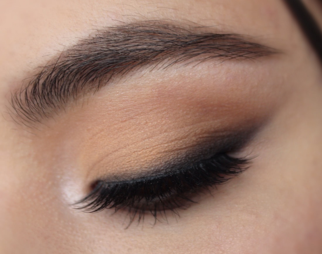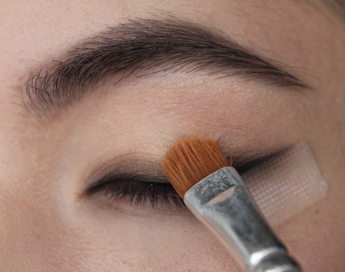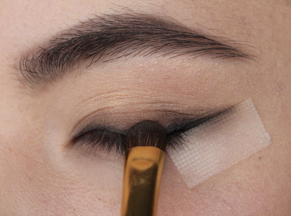 - Растушевать подводку, стерев границу с тенями. При растушёвке следует вытянуть тон на зону складки и немного выше.