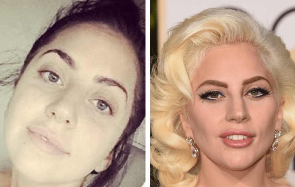 - Леди Гага. Вот уж кого трудно представить без безумного мейкапа. Во время работы певица и с недавних пор актриса очень устает от услуг визажистов, поэтому в обычной жизни практически не красится.Надо признать, Леди Гага с гримом и без него – это два совершенно разных человека. Истинная красота с уникальными чертами лица и запоминающейся внешностью.