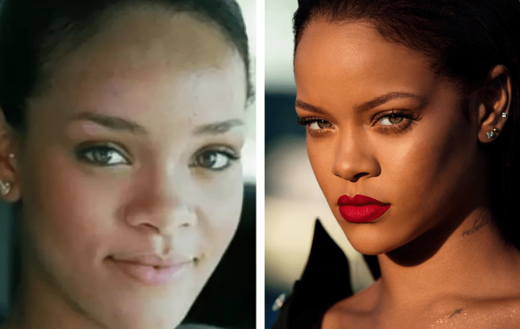 Рианна. Одна их первых селебрити, которая стала появляться на публике без макияжа. Хоть Рианна и обладает ровным тоном кожи и отсутствием морщин, все же ее внешность значительно отличается от той, которую мы чаще всего видим на таблоидах.
