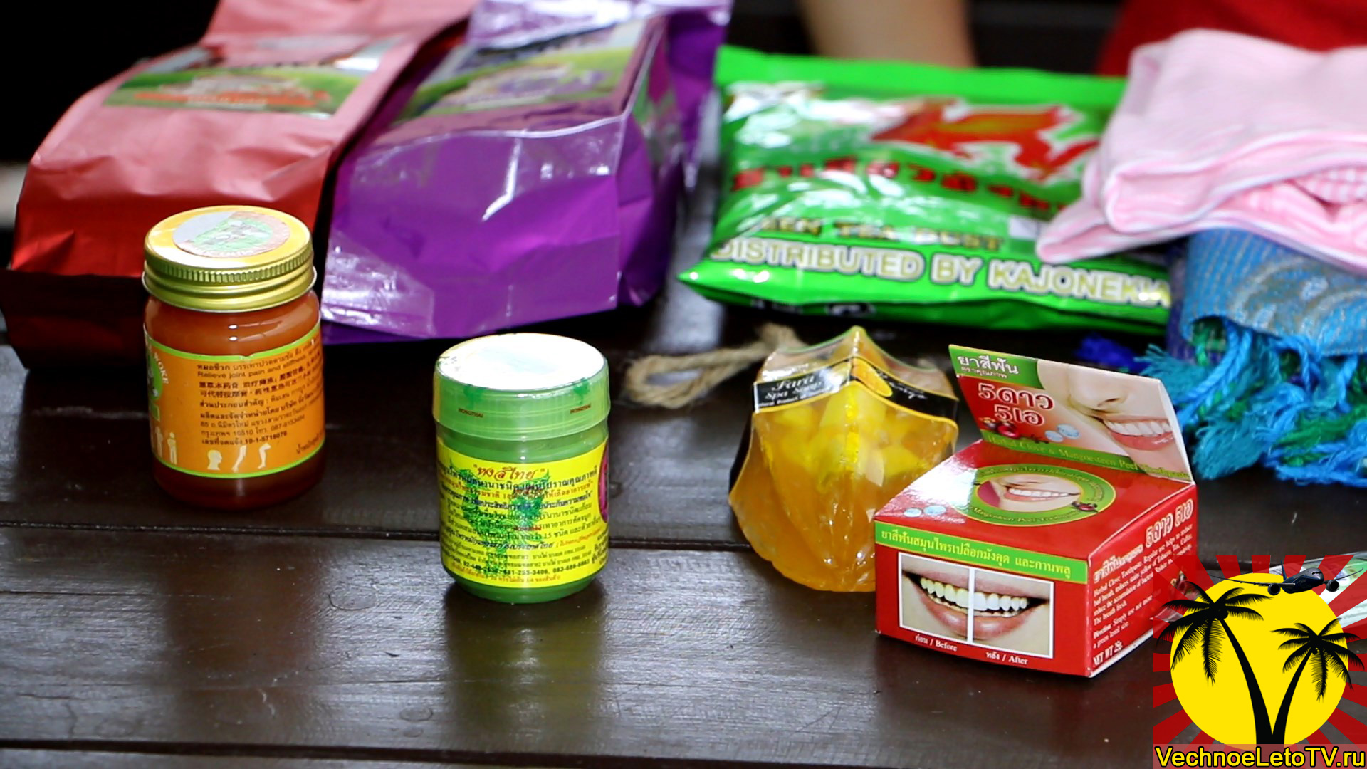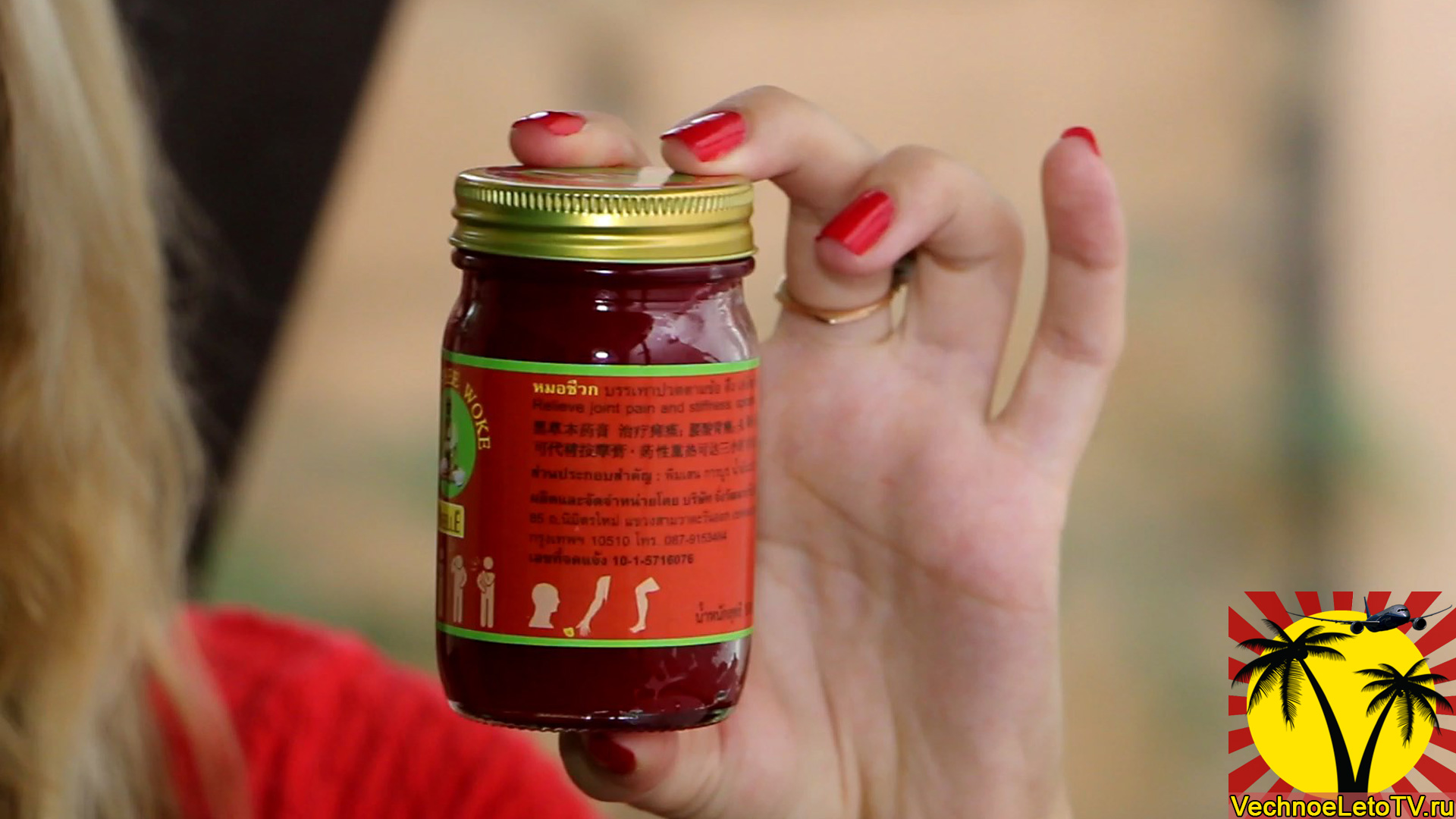 В Таиланде продают огромное количество мазей для массажа, бальзамов для обезболивания и лечения болезней опорно-двигательного аппарата. В их составе используют камфору, вытяжку из эвкалипта и целебные травы. На прилавках выставлены баночки разных цветов и размеров. В желтый бальзам добавляют куркуму, в зеленый — вытяжку из листьев пандана, в черный — размолотые семена кунжута, а в красный — острый перец чили.