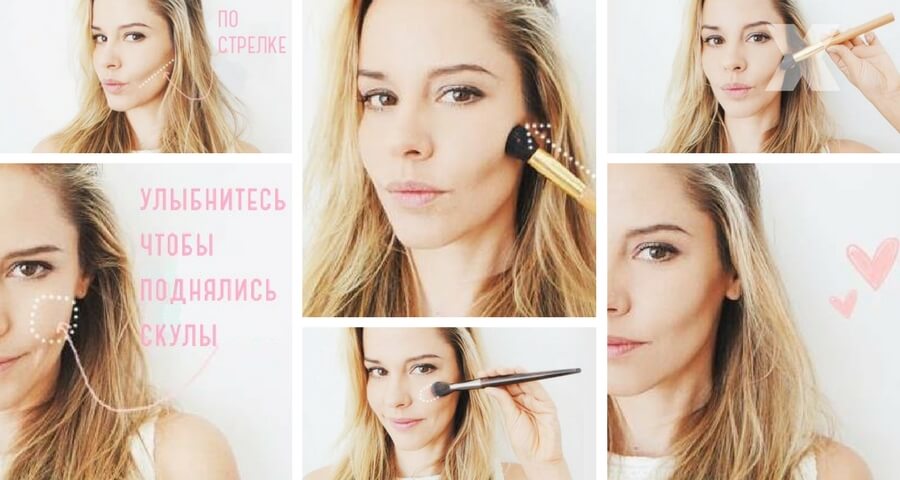 Главная косметика для скул — это румяна. Для выступающей части щеки понадобятся румяна на пару тонов светлее вашего оттенка кожи. Наносите их, начиная движение от крыльев носа и заканчивая у височной части. Затем используйте более темный оттенок. Его следует использовать ниже первого слоя, начиная от подбородка и доводя до висков.