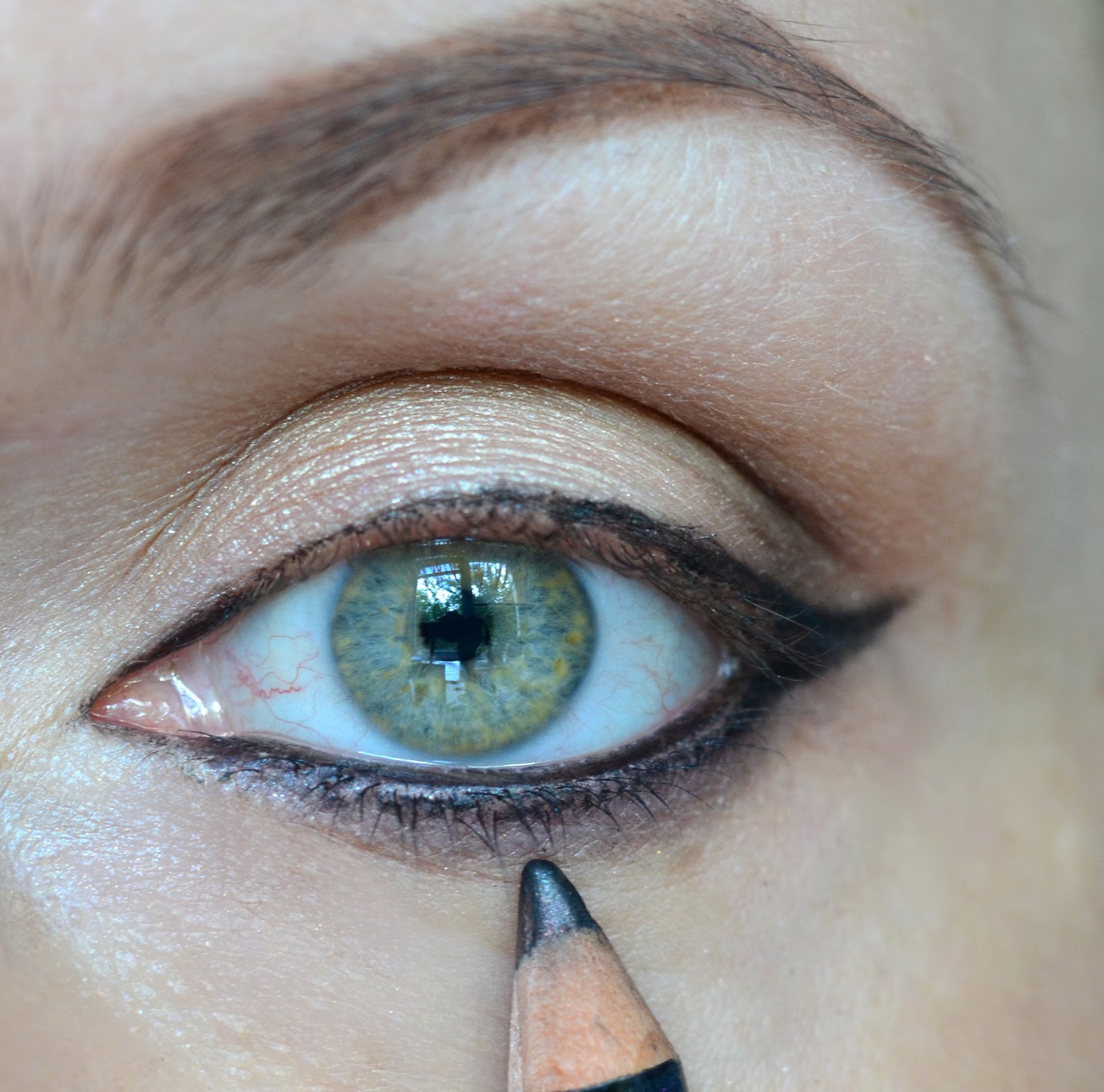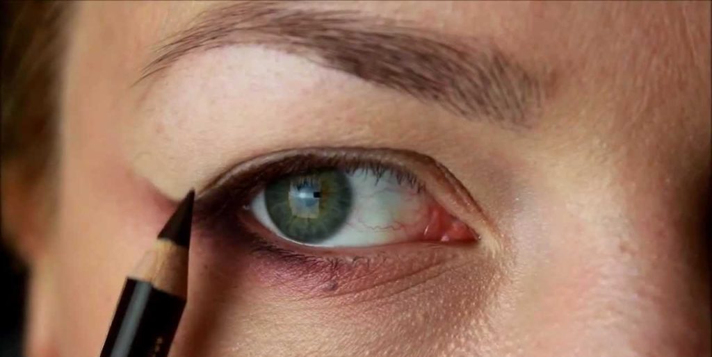 - После нанесения основы под макияж остро отточенным карандашом рисуется тонкая линия как можно ближе к линии роста ресниц;