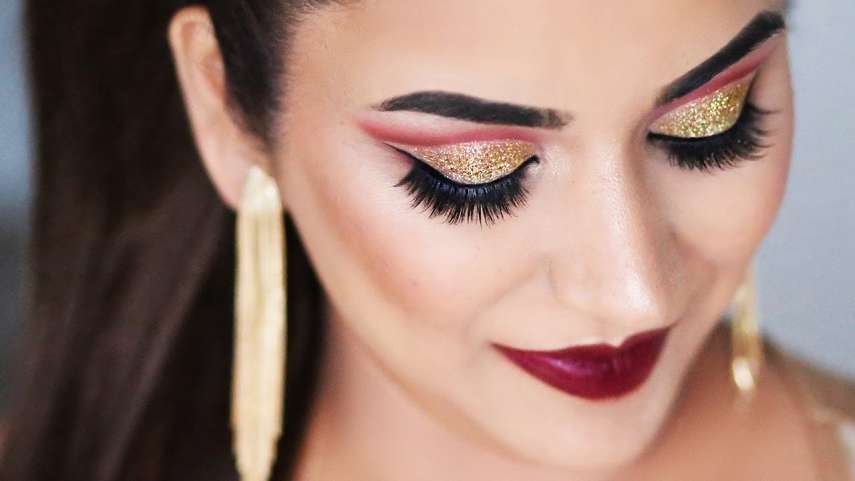 Глиттер можно нанести поверх теней или сделать блестящую подводку, а завершат блистательный образ тушь и помада сочных оттенков.