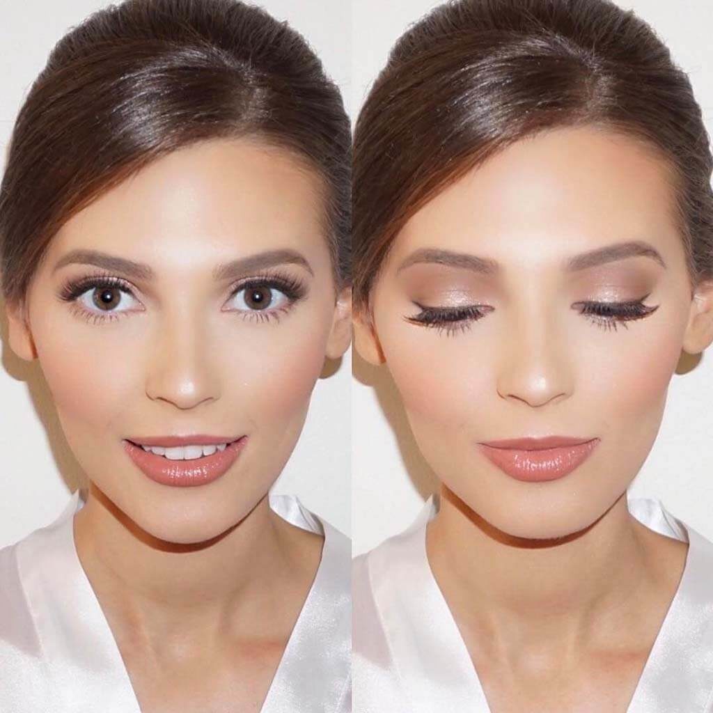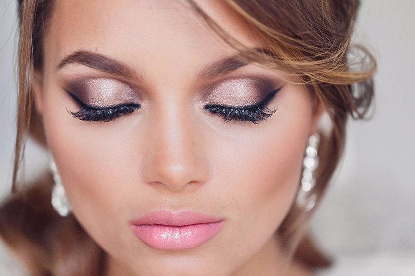 Свадебный макияж подбирается под образ невесты. Классический — естественно никто не отменял, и он популярен всегда. На веко наносятся светло-бежевые, нежно-розовые, персиковые тона теней, а складка оттеняется темной растушеванной полосой. Выразительности взгляду придадут черные тонкие стрелки и насыщенно накрашенные ресницы, как показано на фото.