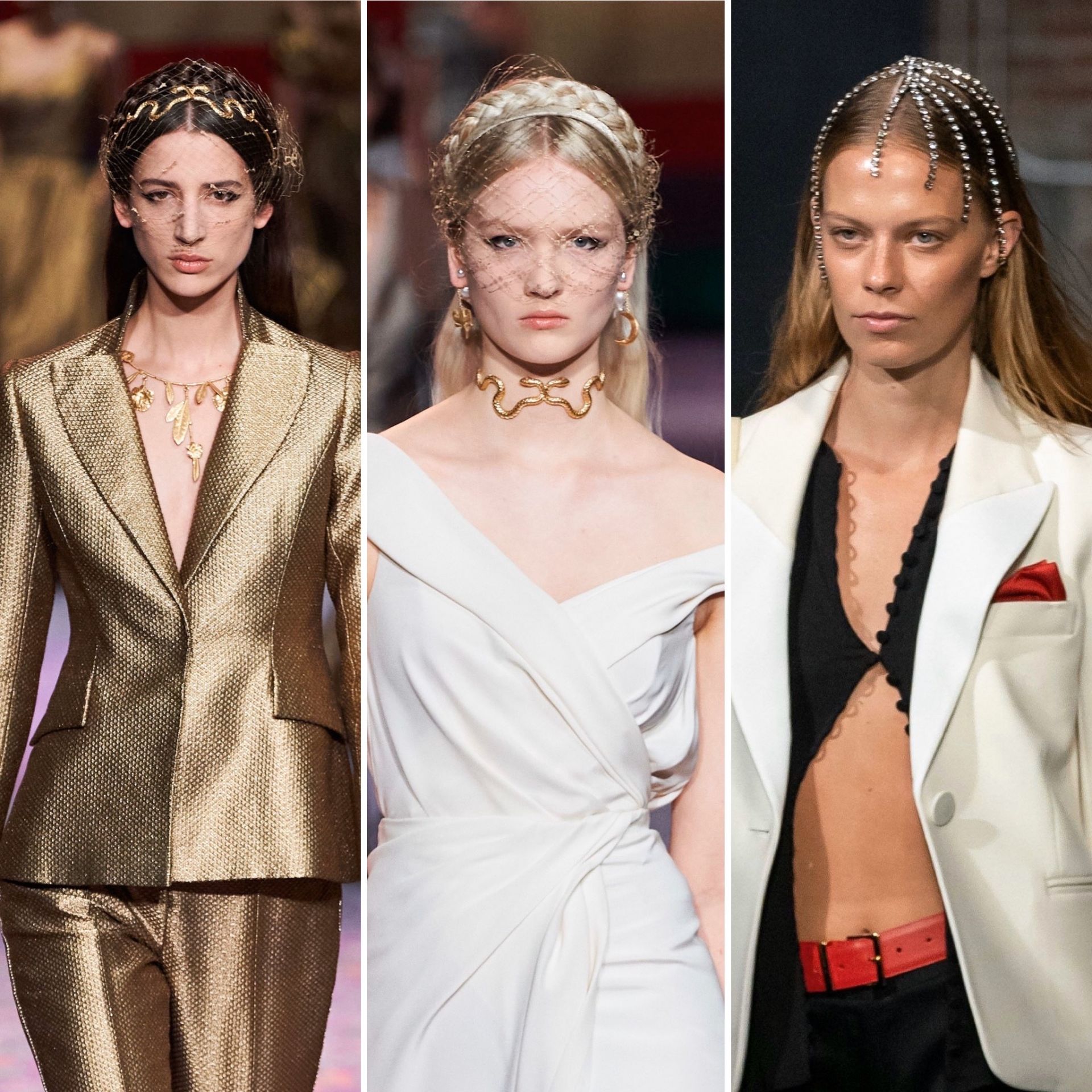 Неожиданным стало возвращение разнообразных аксессуаров для волос – заколок, платков и ободков. Правда, заколки теперь используют не по прямому назначению, а во имя искусства: их носят на распущенных волосах в качестве украшения или декорируют ими изящные косы и высокие хвосты. Заколки, состоящие из стразов, – настоящий must-have 2020 года: они будто стекают по волосам, добавляя образу эффект праздничной вечеринки. Металлические украшения для волос в виде разнообразных цепей отсылают к стилю гранж и активно используются стилистами, а широкие ленты помогают создать элегантный винтажный образ.
