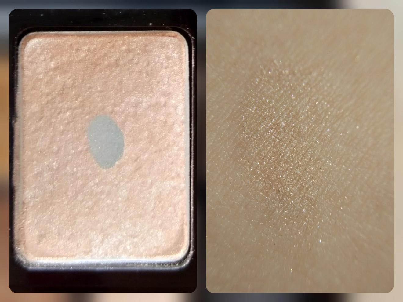 Оттенок #1 в палитре теней можно назвать шиммерным — невооружённым взглядом заметны голубовато-зеленые переливающиеся крупные частицы. Основа — интерферирующий перламутр с оранжево-розовым отливом, цвета как такового не имеет, прозрачна при нанесении, заметны лишь блёстки и перелив. Текстура очень легко захватывается аппликатором, даже с излишком.
