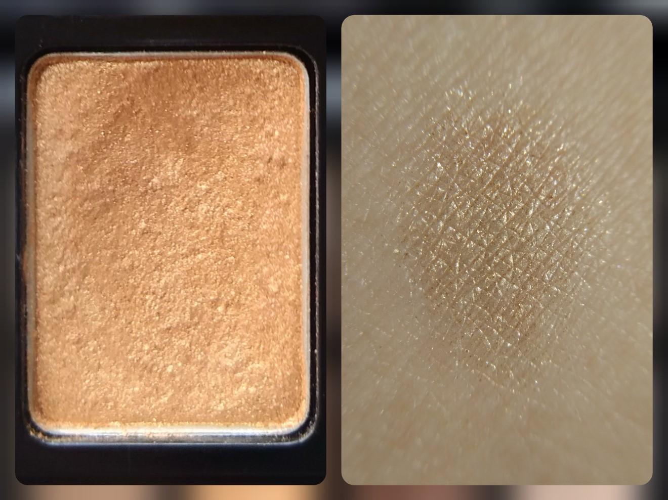Оттенок #3 я бы назвала «розовое золото», так как в своей основе он имеет розовато-коричневый цвет, а вот блёстки, дающие эффект перламутра, золотистого цвета. Интересное наблюдение: при неправильном нанесении на верхнее и особенно нижнее веко эти тени делают глаз воспаленно-красным, больным. Очень редко беру этот цвет в макияж, он сохранился почти нетронутым. Трудно набирается на аппликатор, плотный.