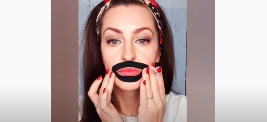 - Тонкую полоску тейпа нужно прикрепить над губой, перед этим будто «спрятав» внутрь верхнюю губу;