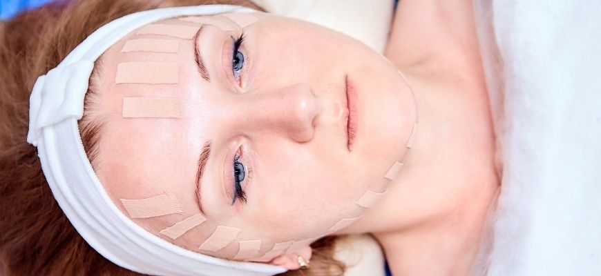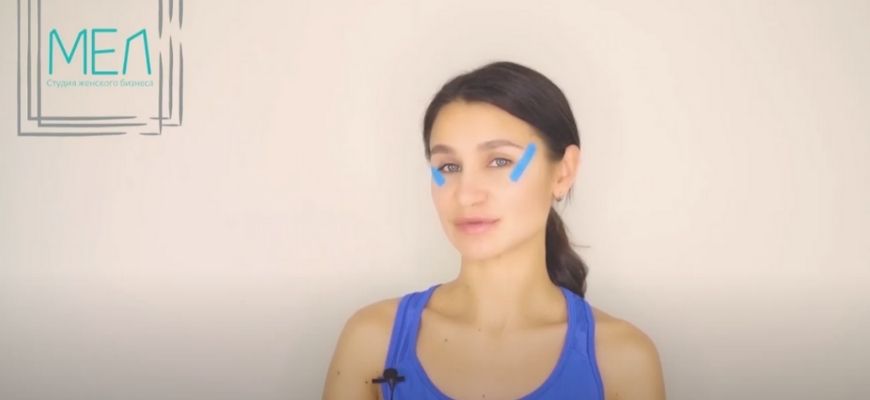 Помимо щек и губ, правильно будет наклеить тейпы над бровями, на носогубные складки и подбородок. Это поможет убрать морщины у глаз и лица, а также подтянуть кожу на шее.