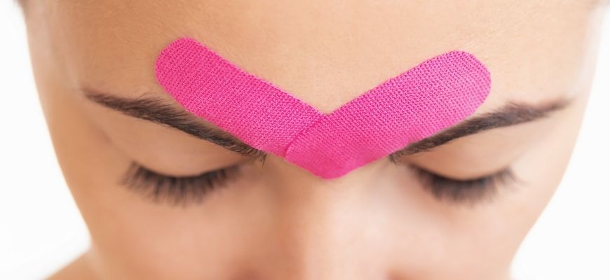 Возьмите 5 см тейп. Рукой чуть-чуть натяните кожу у начала роста волос. Начинайте клеить над переносицей и бровями. Либо наклейте несколько прямоугольников как на фото: