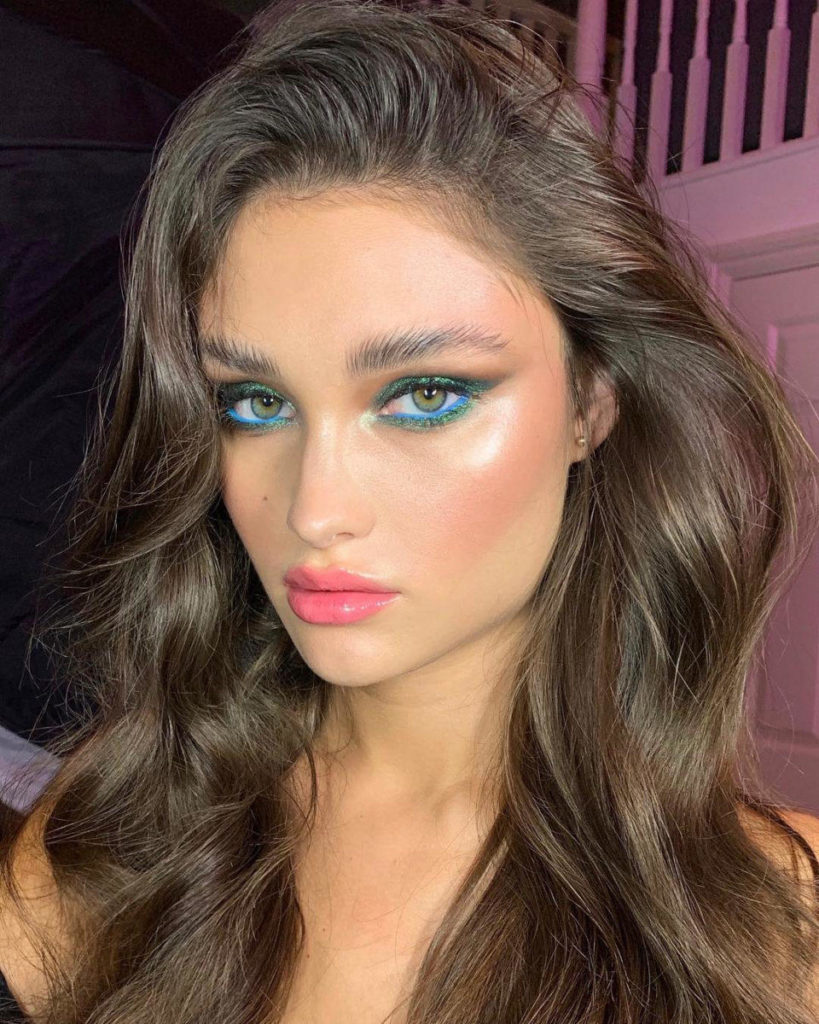 Сверху на темные наносят тени более яркого цвета: темно-синего, зеленого, графитового. Дерзкий макияж трудно представить без нанесения при помощи темных теней толстой линии вдоль нижнего века.
