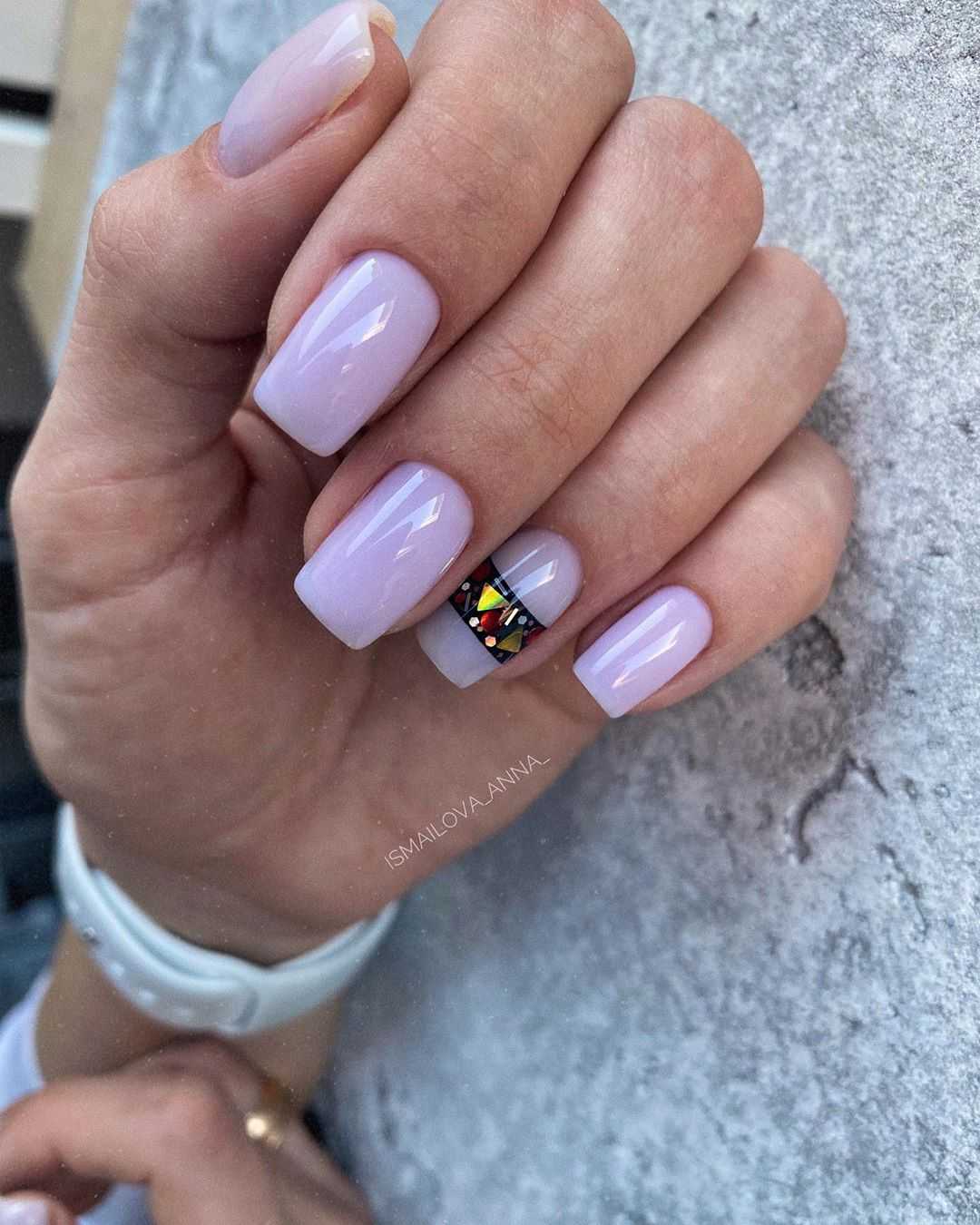 нюд и лаванда. Еще один интересный вариант для покрытия, если хочется чего-нибудь оригинального. Сам по себе лавандовый оттенок довольно яркий, даже если взять самые приглушенные оттенки. А вот добавить немного лаванды к бежевому нюду — это идеально. Можно сделать любой небольшой лавандовый акцент на ногтях.