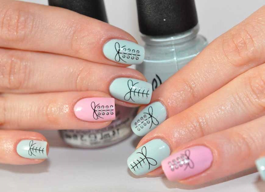 Для лаконичного нейл-арта можно покрыть ногти молочно-розовым оттенком. Указательный и средний пальцы сделать матовыми. На них же разместить парный рисунок нежной веточки, выполненный черным или синим лаком. Получится очень стильно, если ветка будет как-бы скользить по ногтям, спускаясь по бокам с кончика одного ногтя к лунке другого.