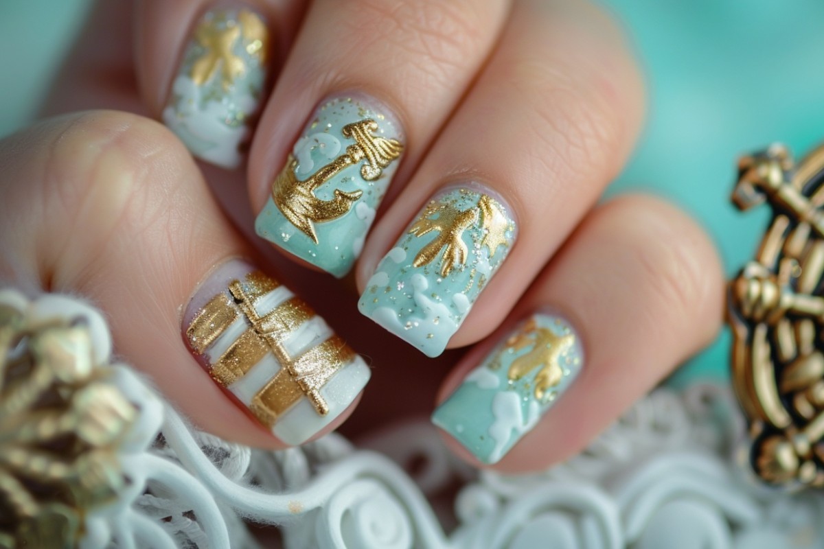 Беспроигрышный вариант – золотистый декор на синем или голубом фоне. При создании такого нейл-арта достигается двойной эффект: основа, ассоциирующаяся с морскими волнами и декоративные элементы, воплощающие летнее тепло. Оригинально смотрится дизайн, включающий чередование якорей и морских звезд на соседних пальцах.