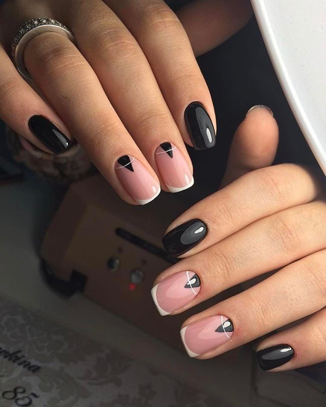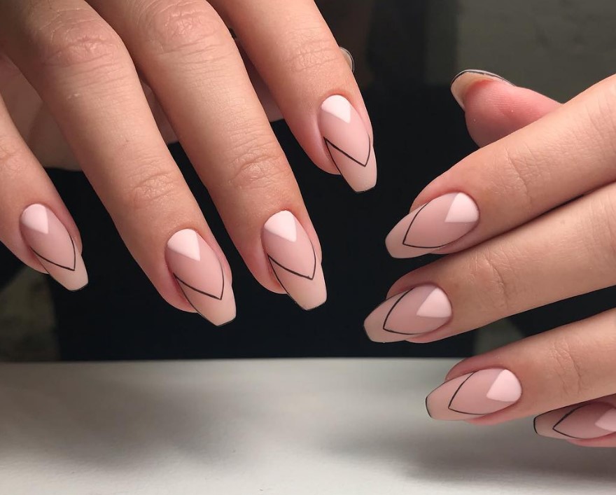Девушки с овальной формой длинных ногтей могут остановить свой выбор на матовом белоснежном дизайне. Также допускается выполнять однотонный черный маникюр. Если хотите слегка разнообразить нейл-арт, выполните лунный маникюр. Суть его заключается в том, что основная часть ногтя покрывается пастельным оттенком. А вот на лунке следует рисовать черные треугольники. Лучше не вплотную к кутикуле наносить пигмент, а слегка отступить от нее.