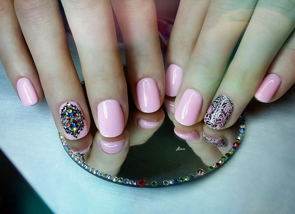 - «дружит» со всеми известными видами аксессуаров, предлагаемыми нейл-индустрией – наклейками и стемпингом, стразами, фольгой, блестками, акриловой пудрой;