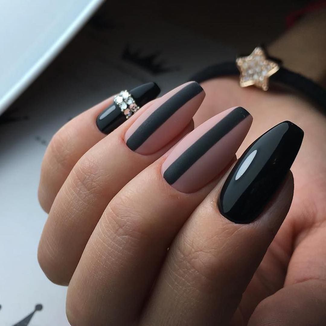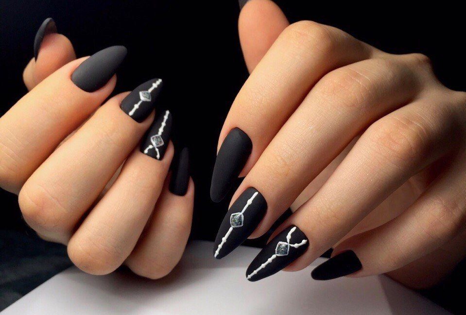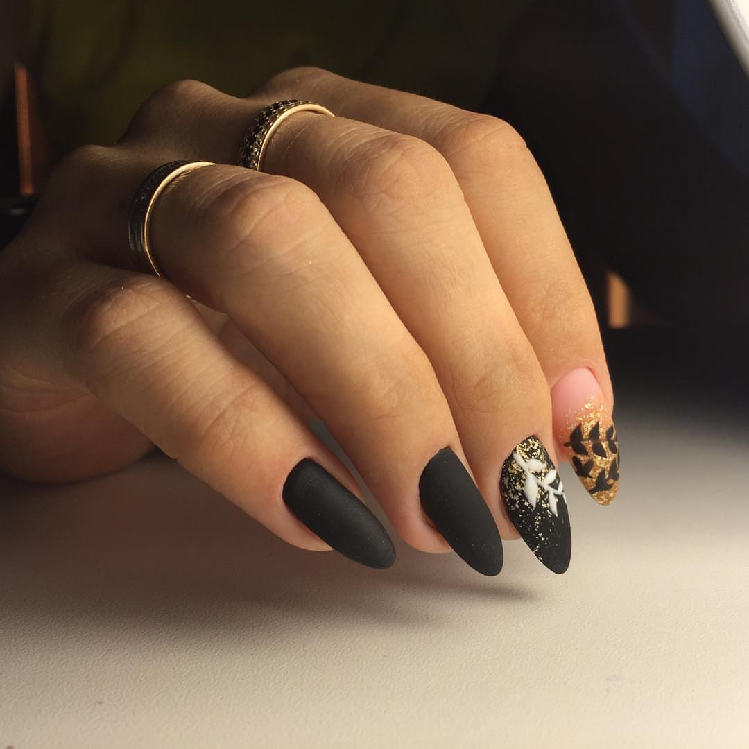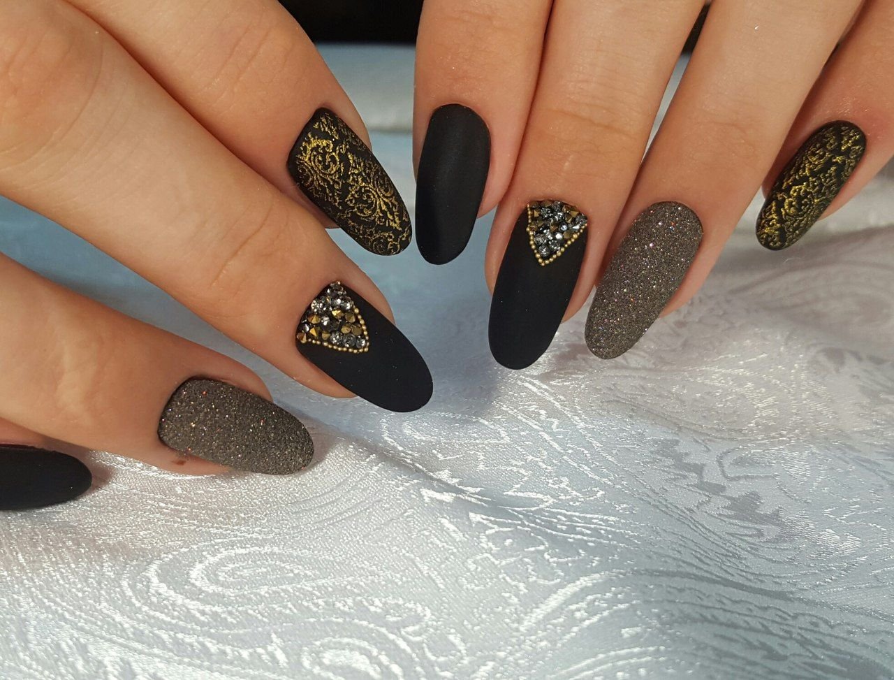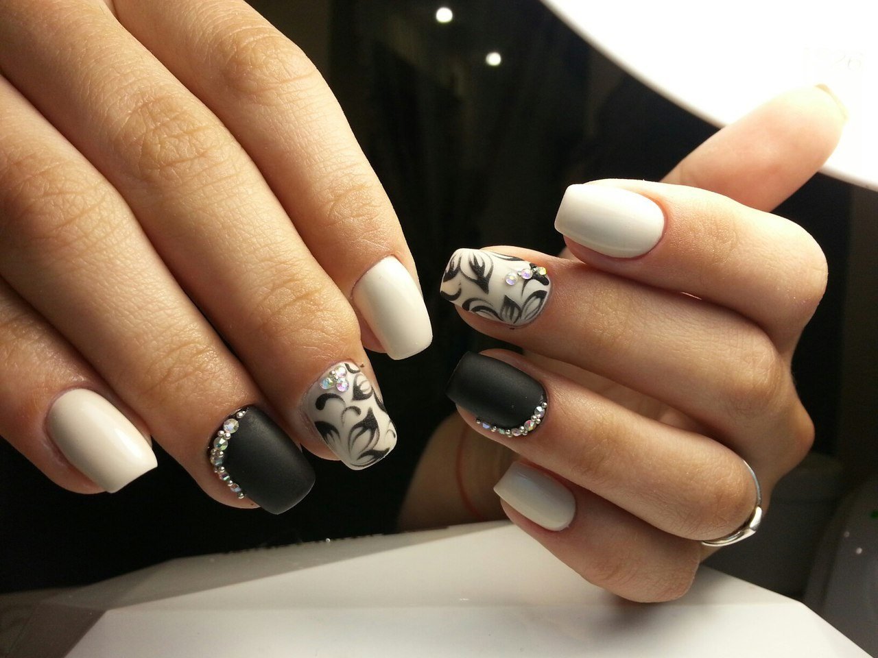 Глянцевое покрытие не является единственным вариантом демонстрации благородства и элегантности чёрного цвета. Матовая текстура в этом случае смотрится не так ярко и при этом прекрасно сочетается со многими деталями декора, которые подбираются по вашему усмотрению. Симпатичные комбинации из страз у основания, полное покрытие хрустальной крошкой в тон лаку безымянного пальчика, блестящие золотистые или серебристые металлизированные полоски, контрастные рисунки, комбинированный дизайн с глянцевыми узорами, а также удивительная идея маникюра в стиле «разные ручки». Не бойтесь экспериментировать.