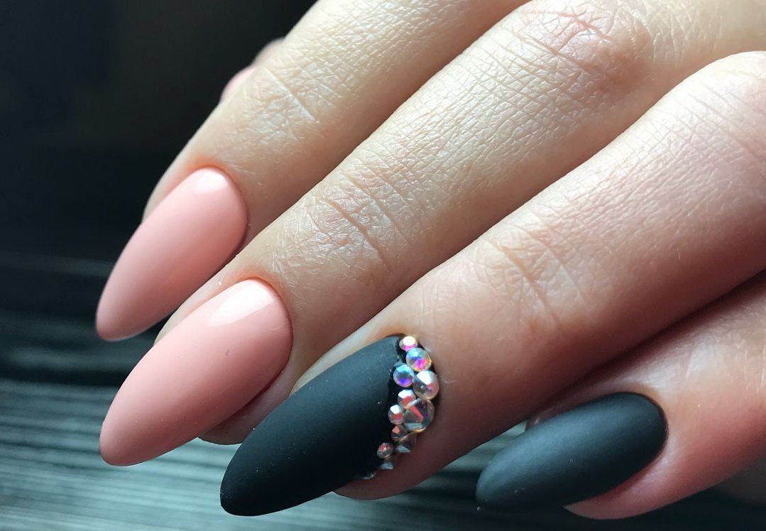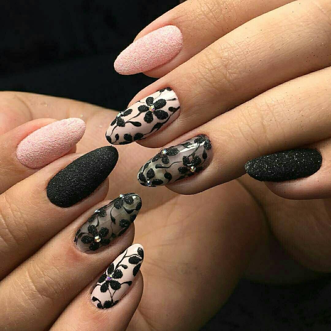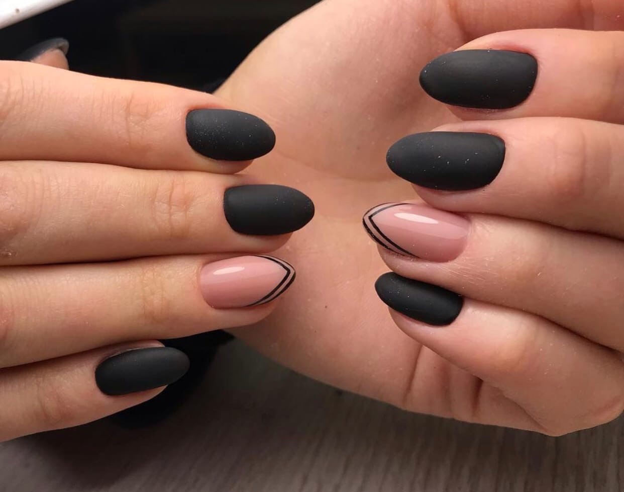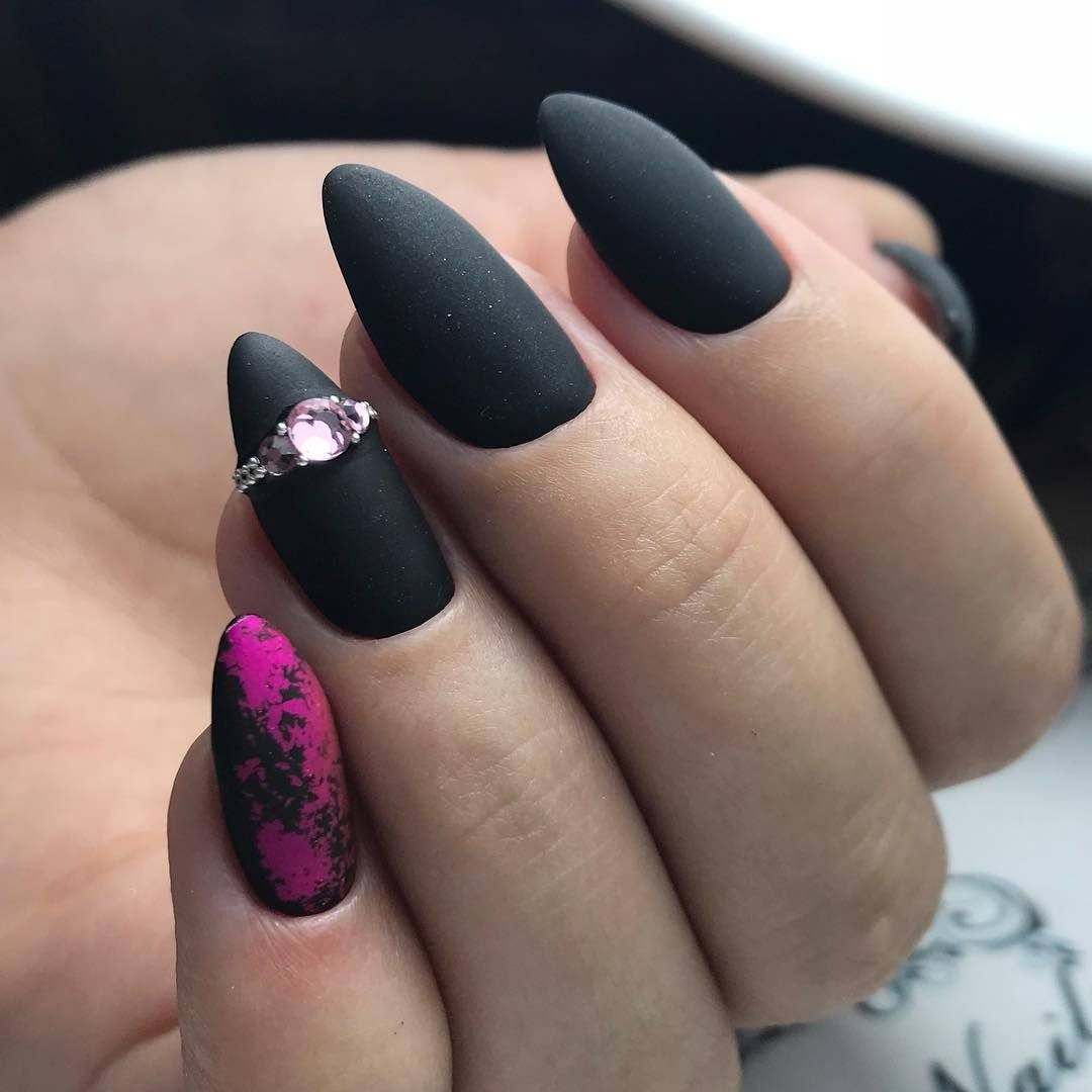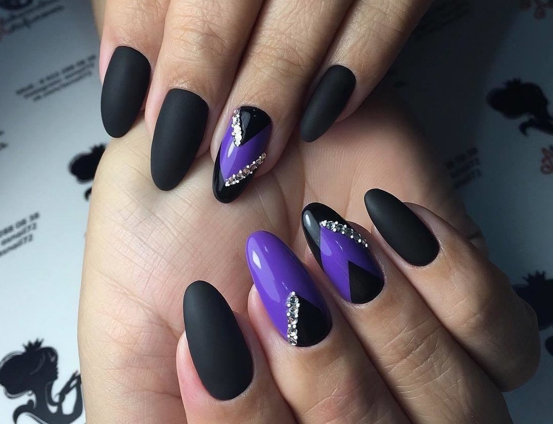 Глянцевое покрытие не является единственным вариантом демонстрации благородства и элегантности чёрного цвета. Матовая текстура в этом случае смотрится не так ярко и при этом прекрасно сочетается со многими деталями декора, которые подбираются по вашему усмотрению. Симпатичные комбинации из страз у основания, полное покрытие хрустальной крошкой в тон лаку безымянного пальчика, блестящие золотистые или серебристые металлизированные полоски, контрастные рисунки, комбинированный дизайн с глянцевыми узорами, а также удивительная идея маникюра в стиле «разные ручки». Не бойтесь экспериментировать.