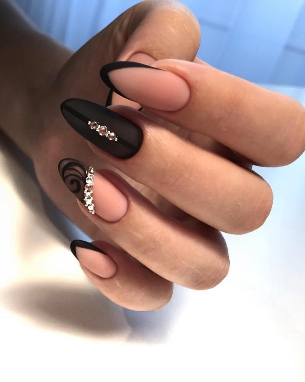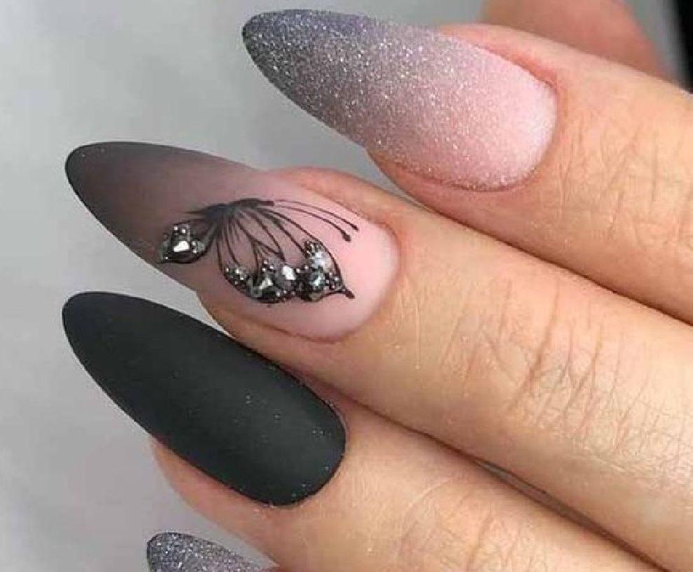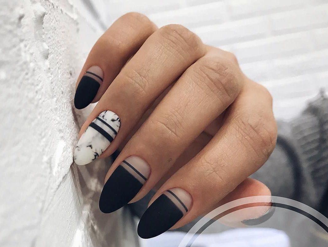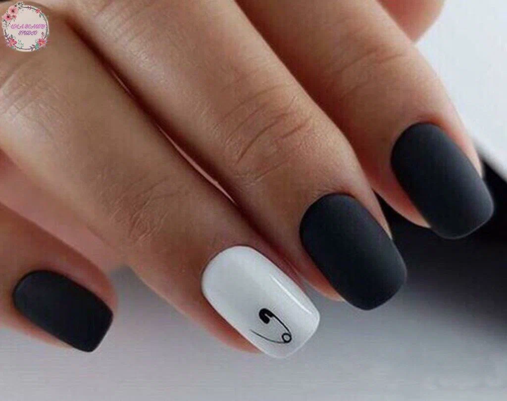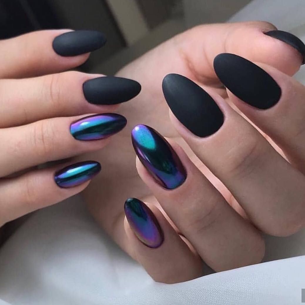 Глянцевое покрытие не является единственным вариантом демонстрации благородства и элегантности чёрного цвета. Матовая текстура в этом случае смотрится не так ярко и при этом прекрасно сочетается со многими деталями декора, которые подбираются по вашему усмотрению. Симпатичные комбинации из страз у основания, полное покрытие хрустальной крошкой в тон лаку безымянного пальчика, блестящие золотистые или серебристые металлизированные полоски, контрастные рисунки, комбинированный дизайн с глянцевыми узорами, а также удивительная идея маникюра в стиле «разные ручки». Не бойтесь экспериментировать.