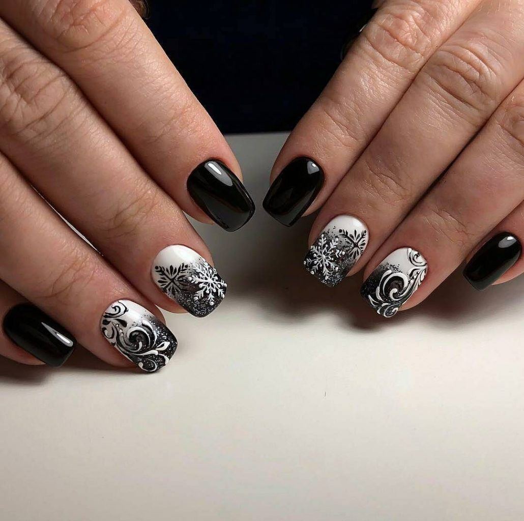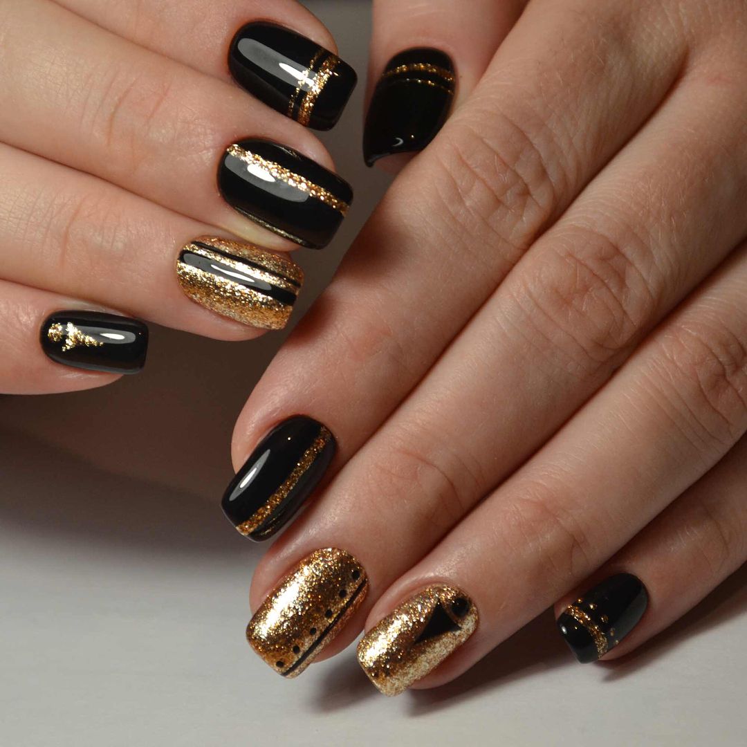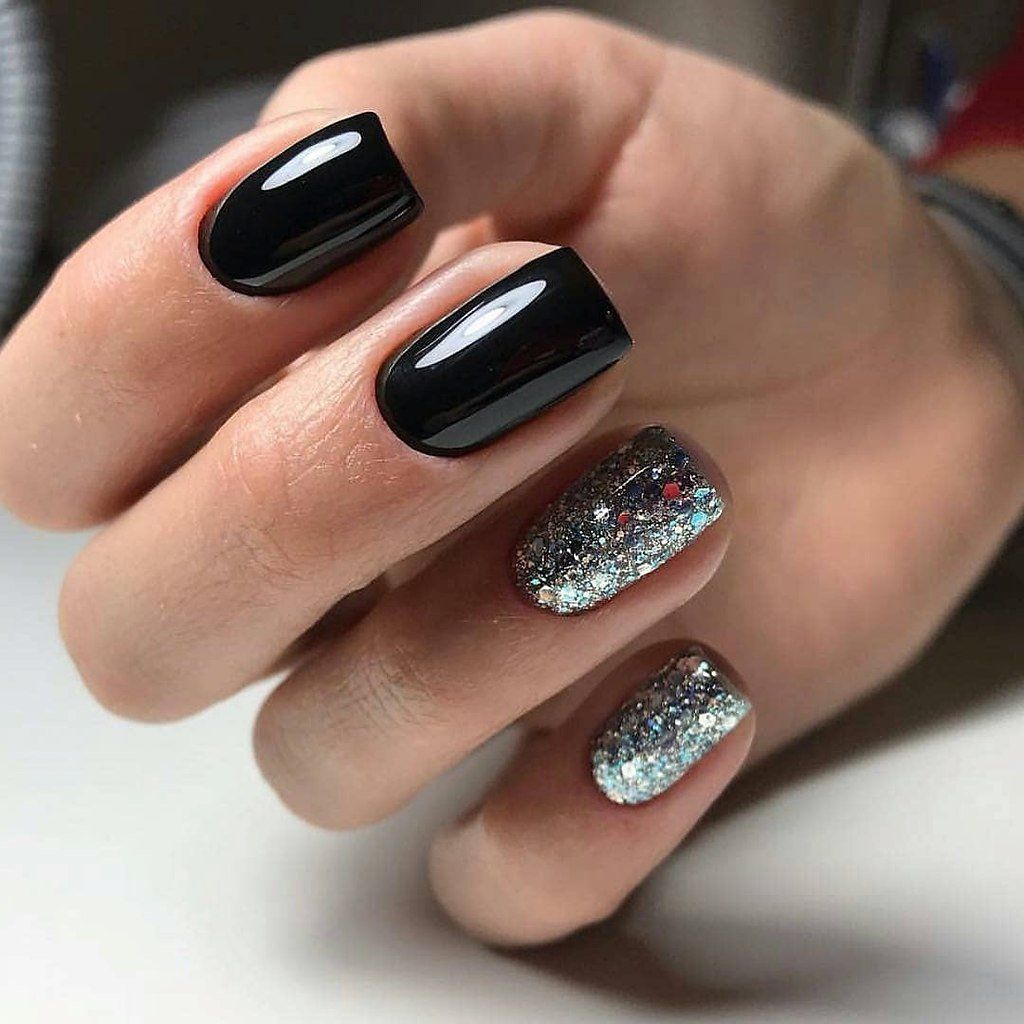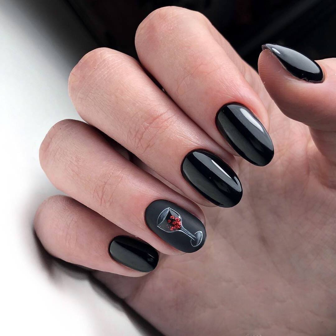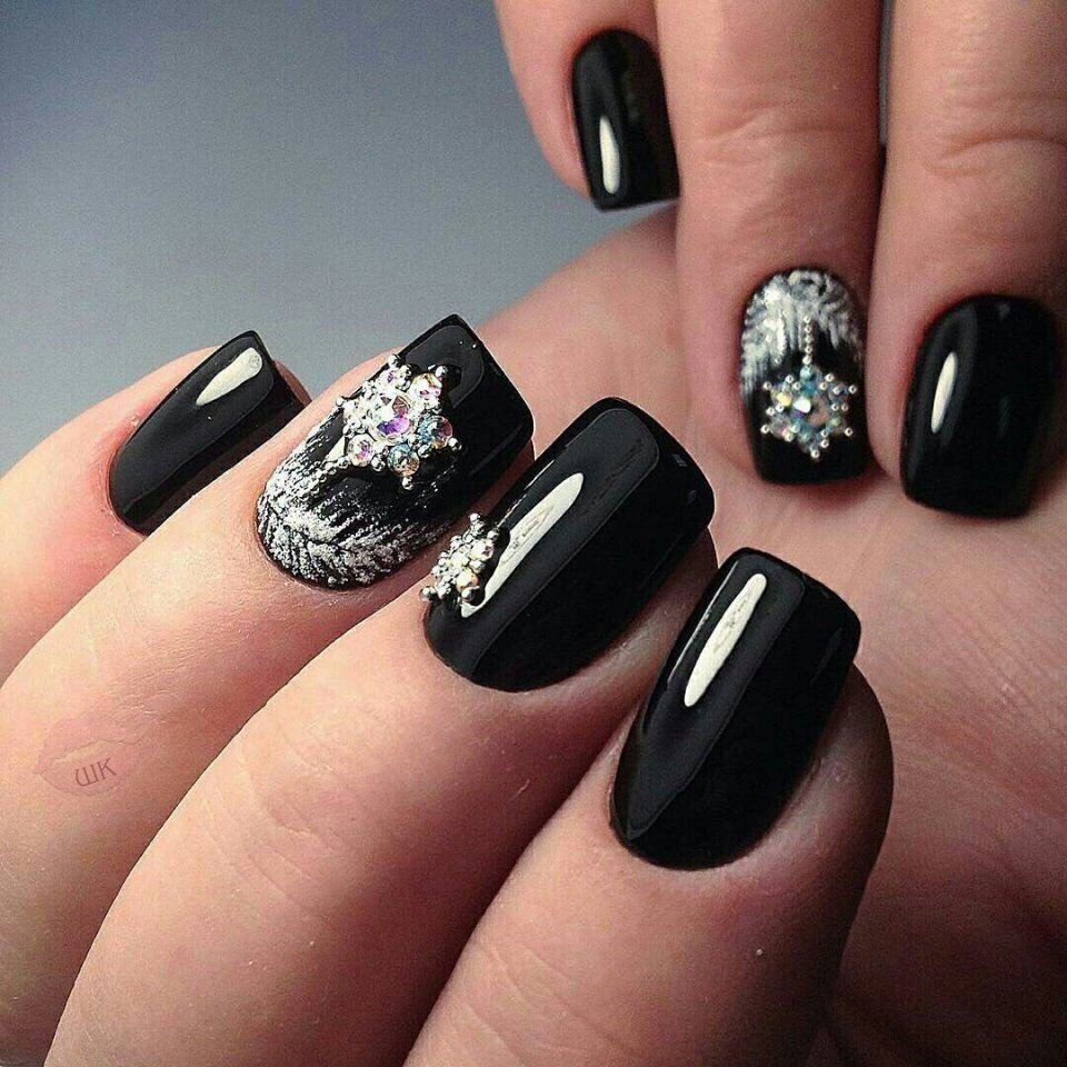 Черный маникюр идеально вписывается в любой образ, а потому считается универсальным. Что касается праздничных луков, то и здесь у него карт-бланш. Нужно просто добавить золотые хлопья, глиттер, стразы, вензеля, расставить цветовые акценты и, вуаля, праздничный дизайн готов.
