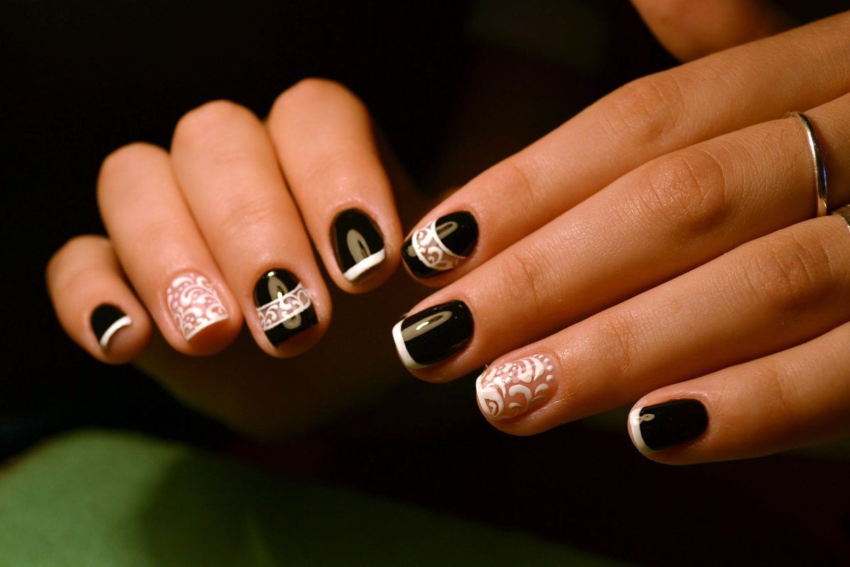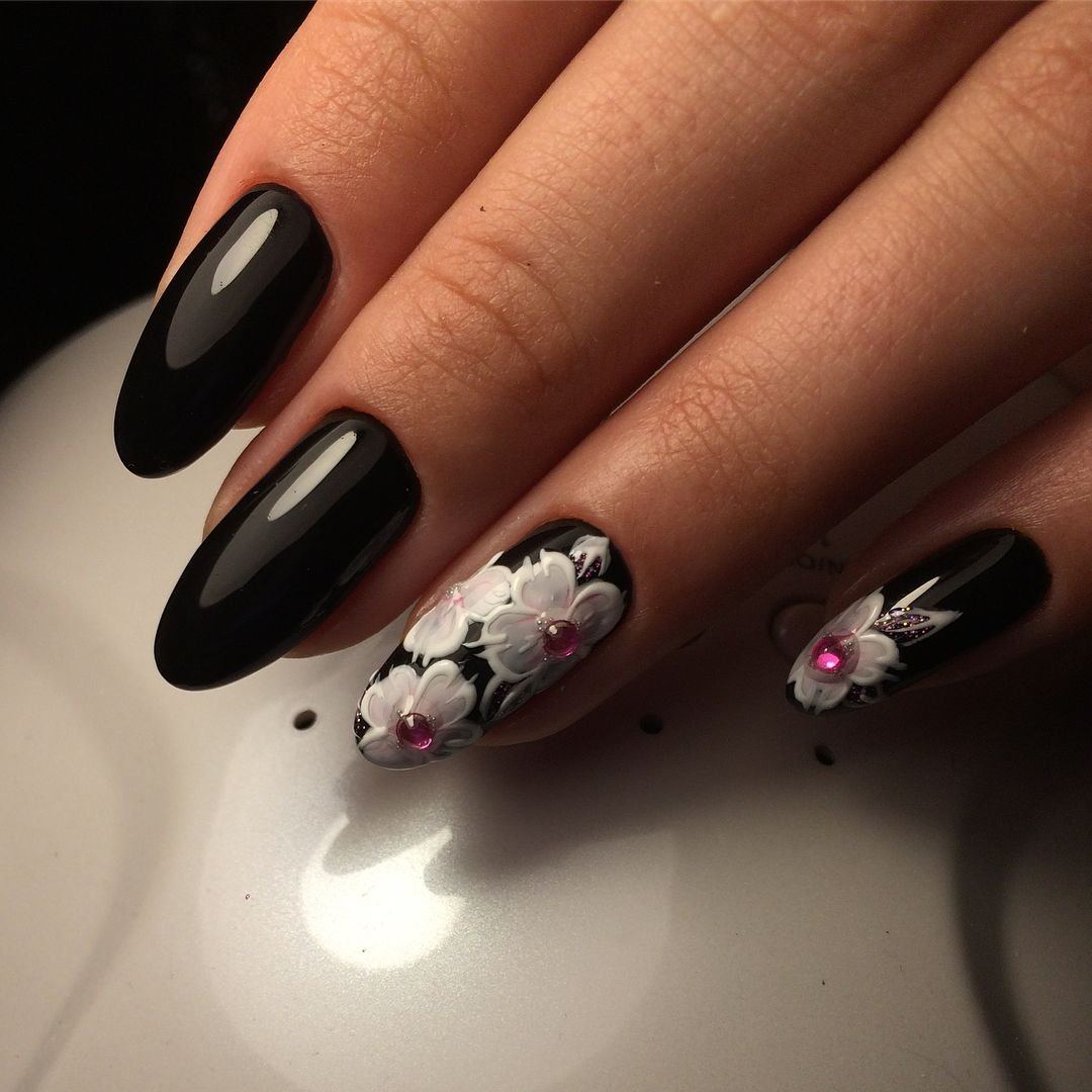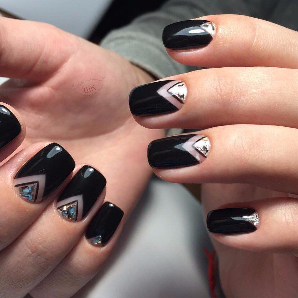 Красота маникюра во многом зависит от правильно подобранной формы и длины ногтей. На каждый день лучше выбрать квадратные короткие ногти — острая форма будет смотреться вызывающе и подойдет не каждой девушке. Фаворитом у дам является миндалевидная форма, она выглядит женственно и стильно. В сочетании с черным лаком и небольшим количеством декора получается экстравагантный маникюр, который подойдет на все случаи жизни.