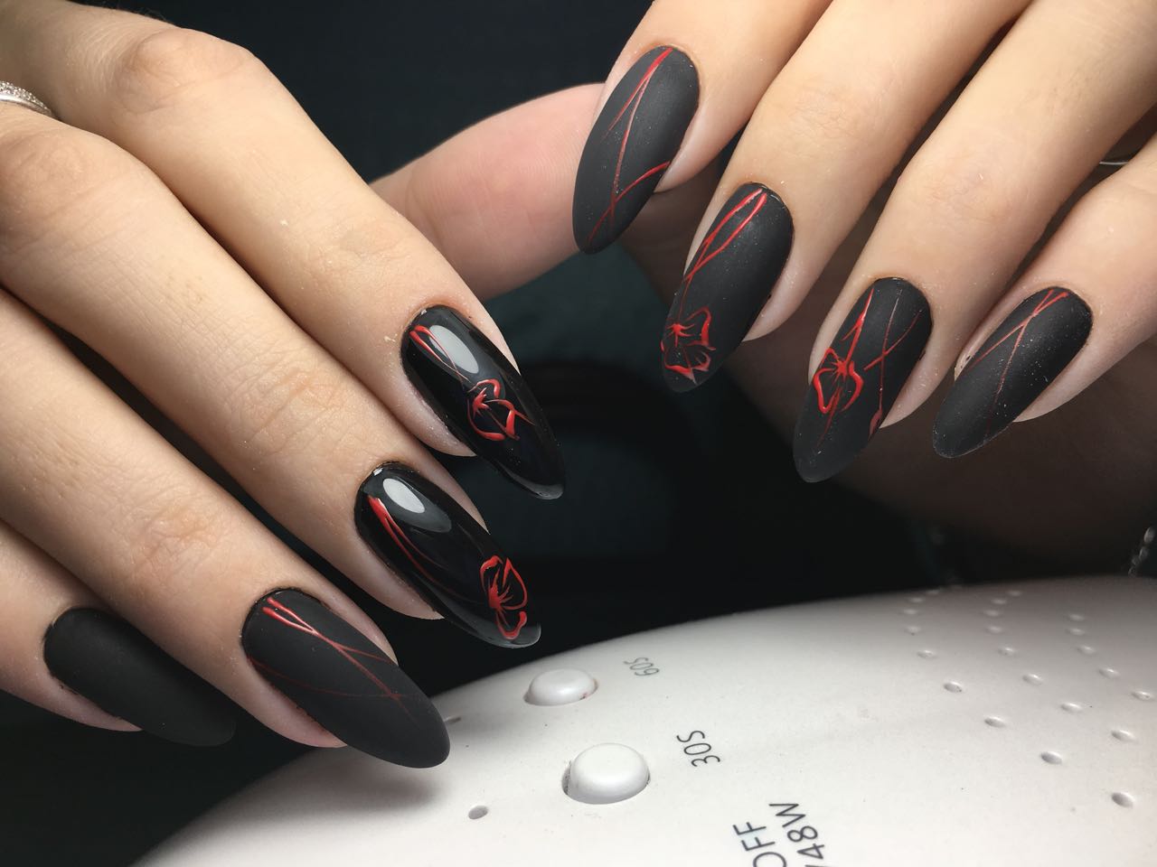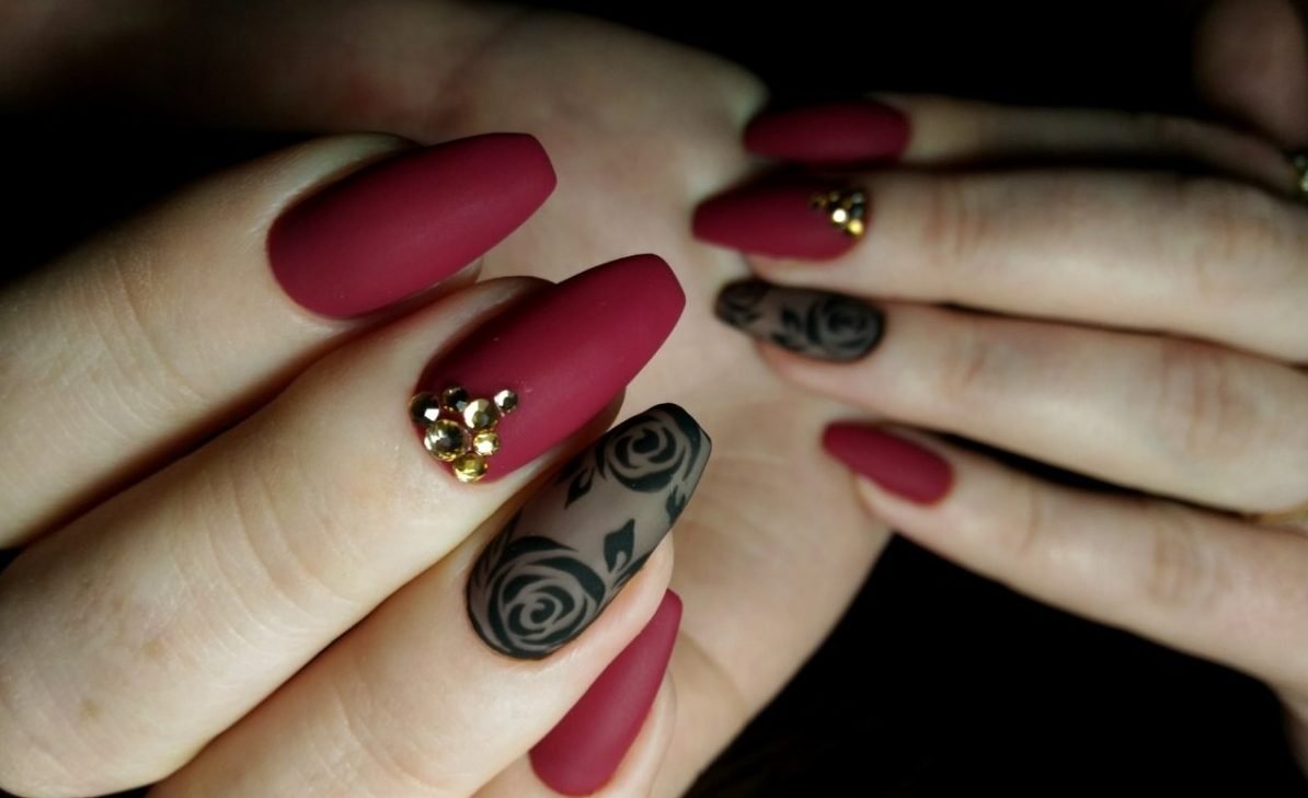 Если и использовать сдержанную матовую фактуру, то экспериментировать с удовольствием и по максимуму. Черное полотно с матовым покрытием просто создано для креативного цветочного оформления. Особого внимания заслуживает комбинация матовых черных ногтей и узоров из красных роз.