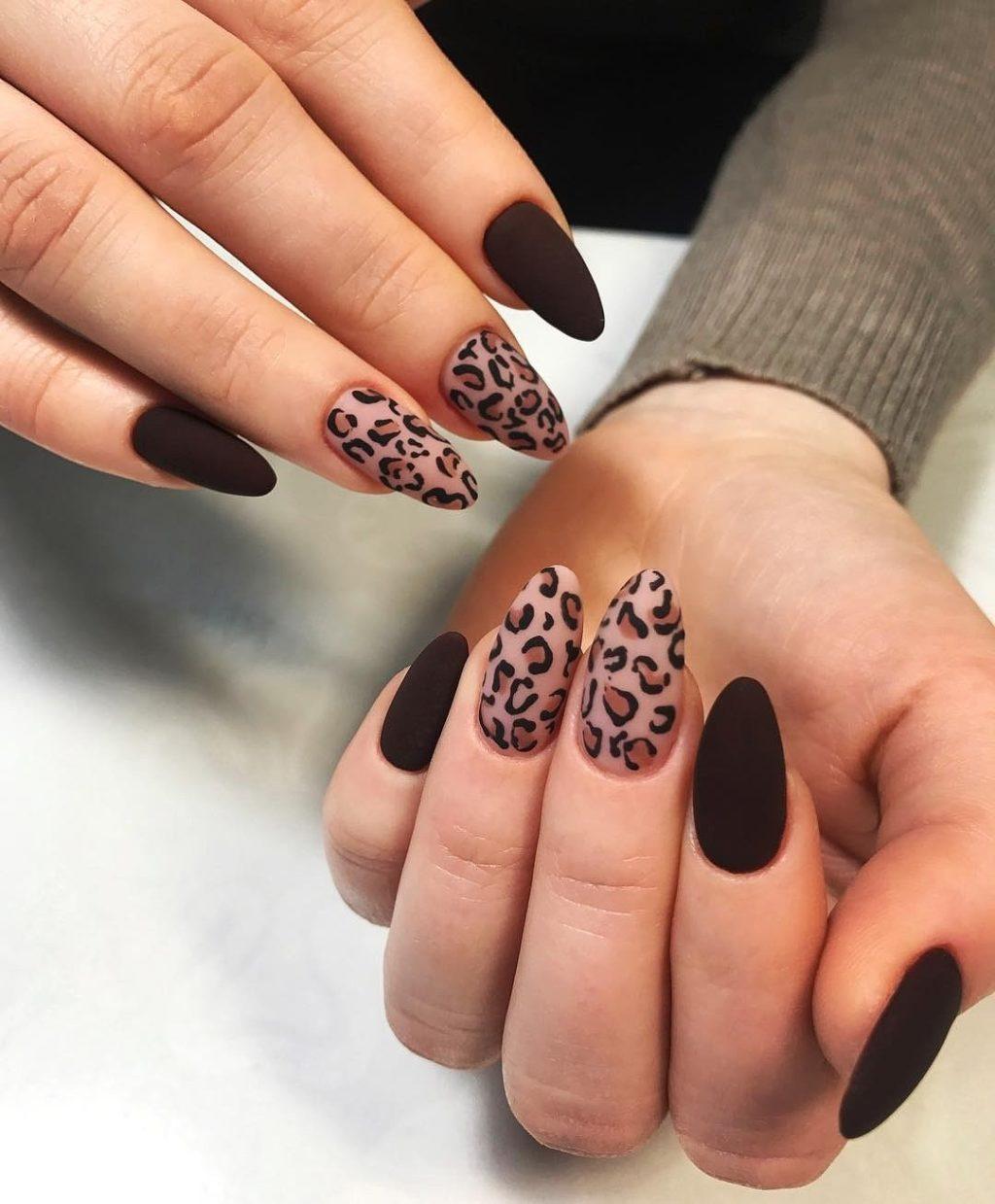 Насыщенные шоколадные оттенки подходят для любого осеннего образа сезона 2020. Очень красиво коричневый маникюр смотрится на коротких ногтях, а что касается дизайна, то этот цвет идеально сочетается с теплыми золотыми блестками или фольгой.