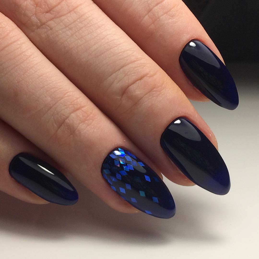 Это один из самых удачных примеров красивого маникюра. Матовое оформление подчеркивает женскую привлекательность. Синий цвет универсален, при нанесении макияжа можно выбрать синие тени, которые подходят всем без исключения. Таким образом создается образ целостности и единства. Если акцент сделать лишь на безымянных пальцах, образ будет элегантным и лаконичным. Это мощный акцент в прекрасном внешнем облике