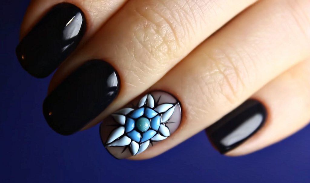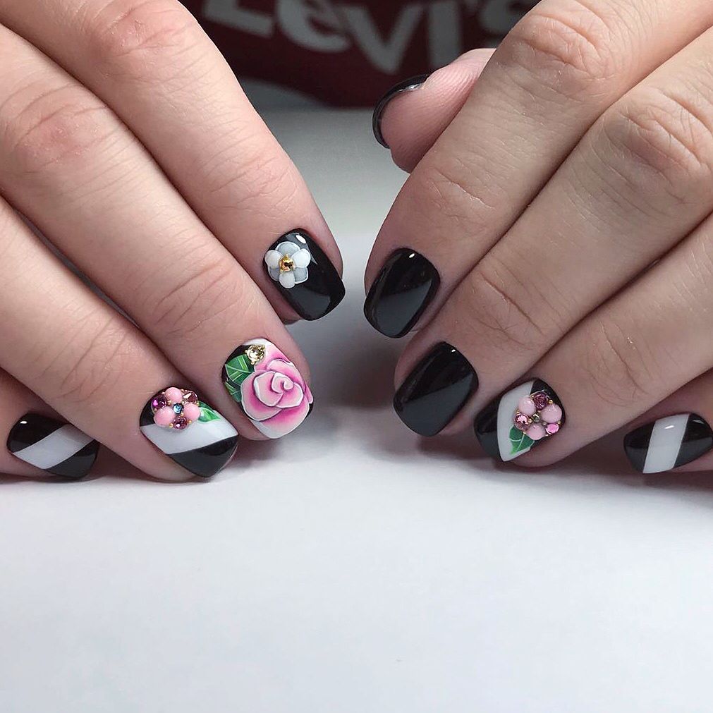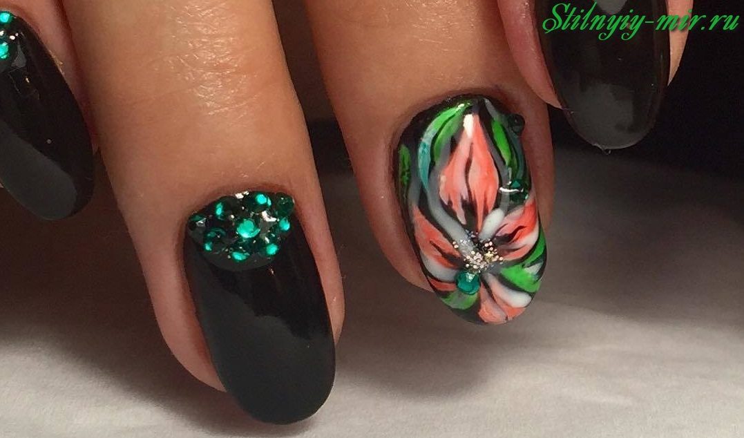 При этом можно также поиграть еще с акцентами, выделяя цветами один или сразу несколько ноготков. Однако полностью все ногти декорировать цветами не стоит. Такой вариант будет слишком вычурным и безвкусным, и даже черная матовая фактура не спасет ситуации.