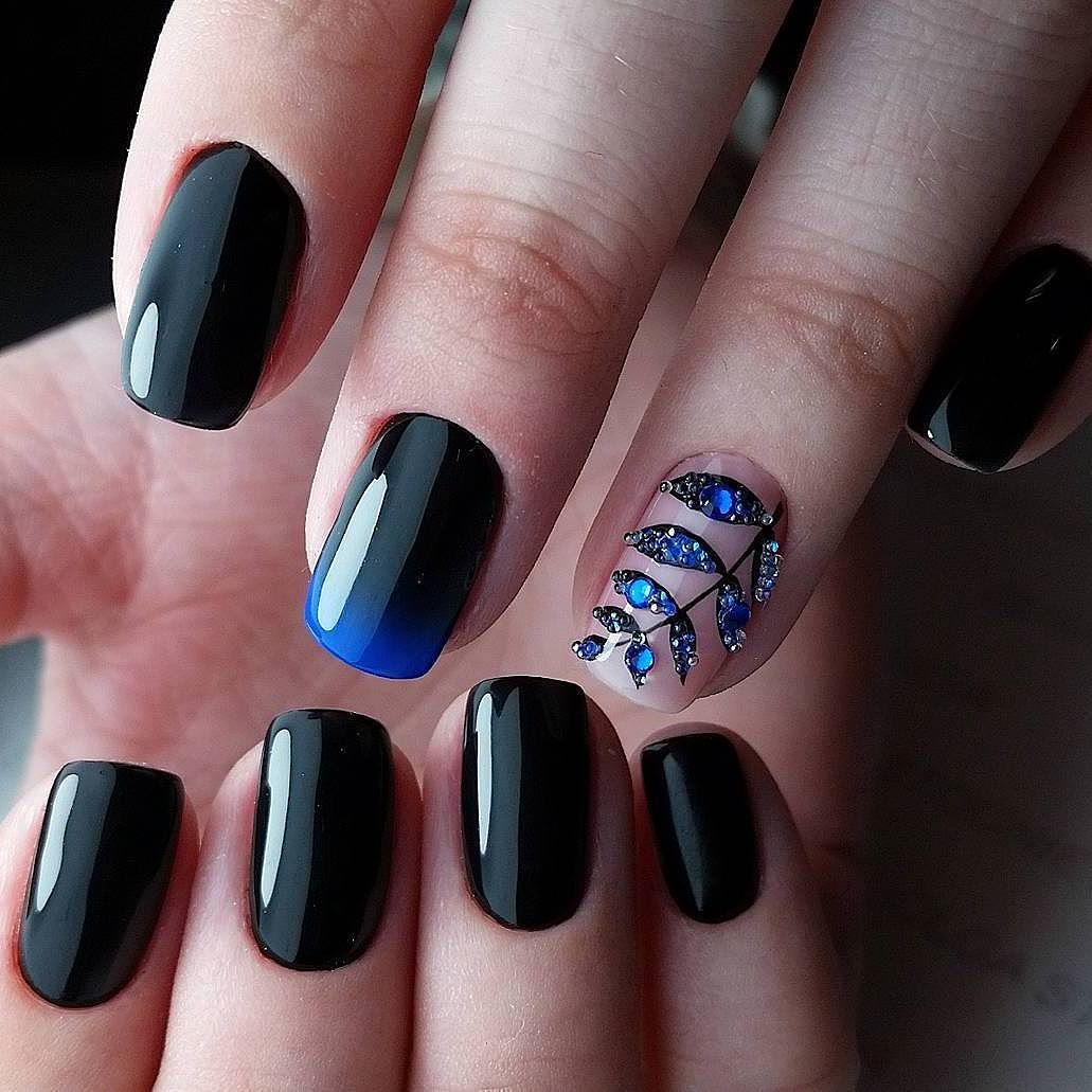В качестве синего оттенка может использоваться не только синий цвет, но также и цвета из его цветовой гаммы. Например, голубой, бирюзовый или ярко-синий будут интересно смотреться в комбинации с серым или черным цветом. Многие мастера используют эти оттенки при выполнении омбре. Для декора используют материалы в виде вензеля, блесток или камней.