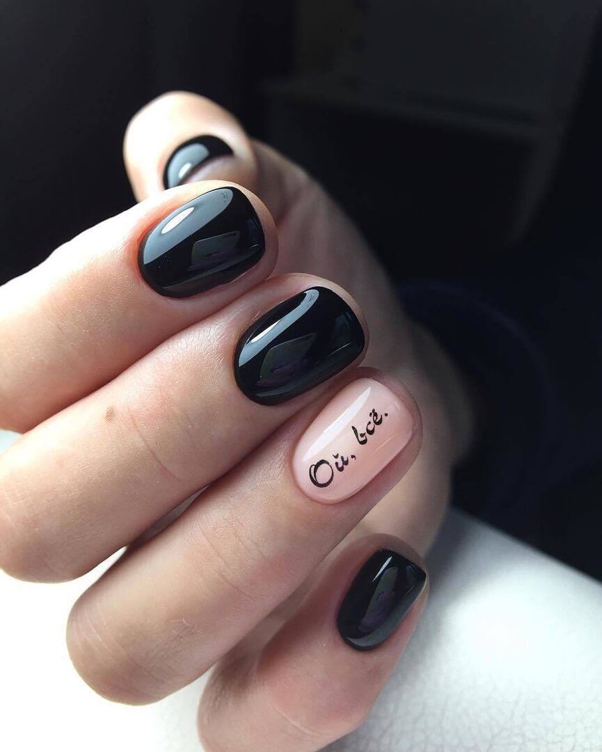 Ярким девушкам, которые следят за последними новинками моды, стоит обратить внимание на черный маникюр с надписями. В тренде слова на английском и французском языке