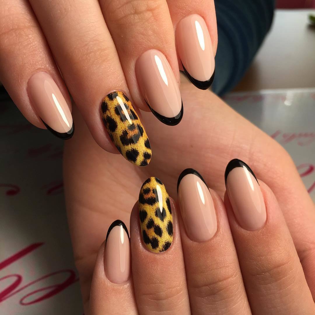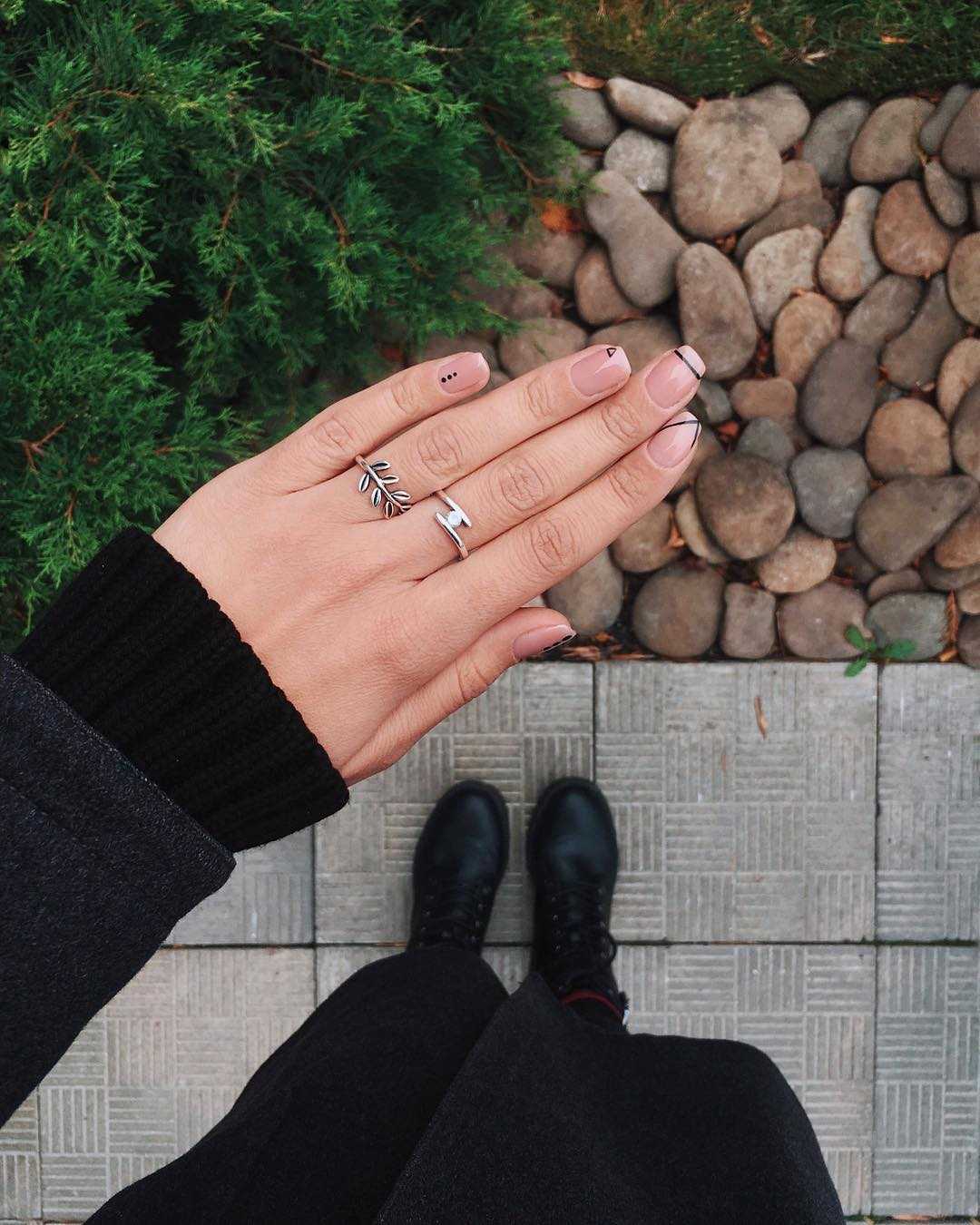 В случае с дизайном, это френч (нюд и темный край), акценты на фоне естественного покрытия, тонкая геометрия, точки, некрупные надписи: лаконично, изысканно, стильно.