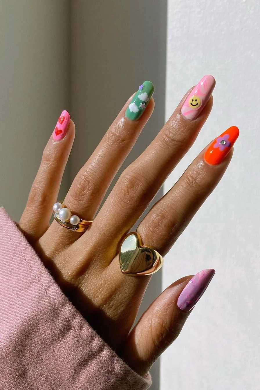 Разноцветный маникюр — самый простой способ дизайна на миндалевидные ногти в 2024 году. Сочетание цветов разноцветного маникюра можно подобрать по разным критериям: