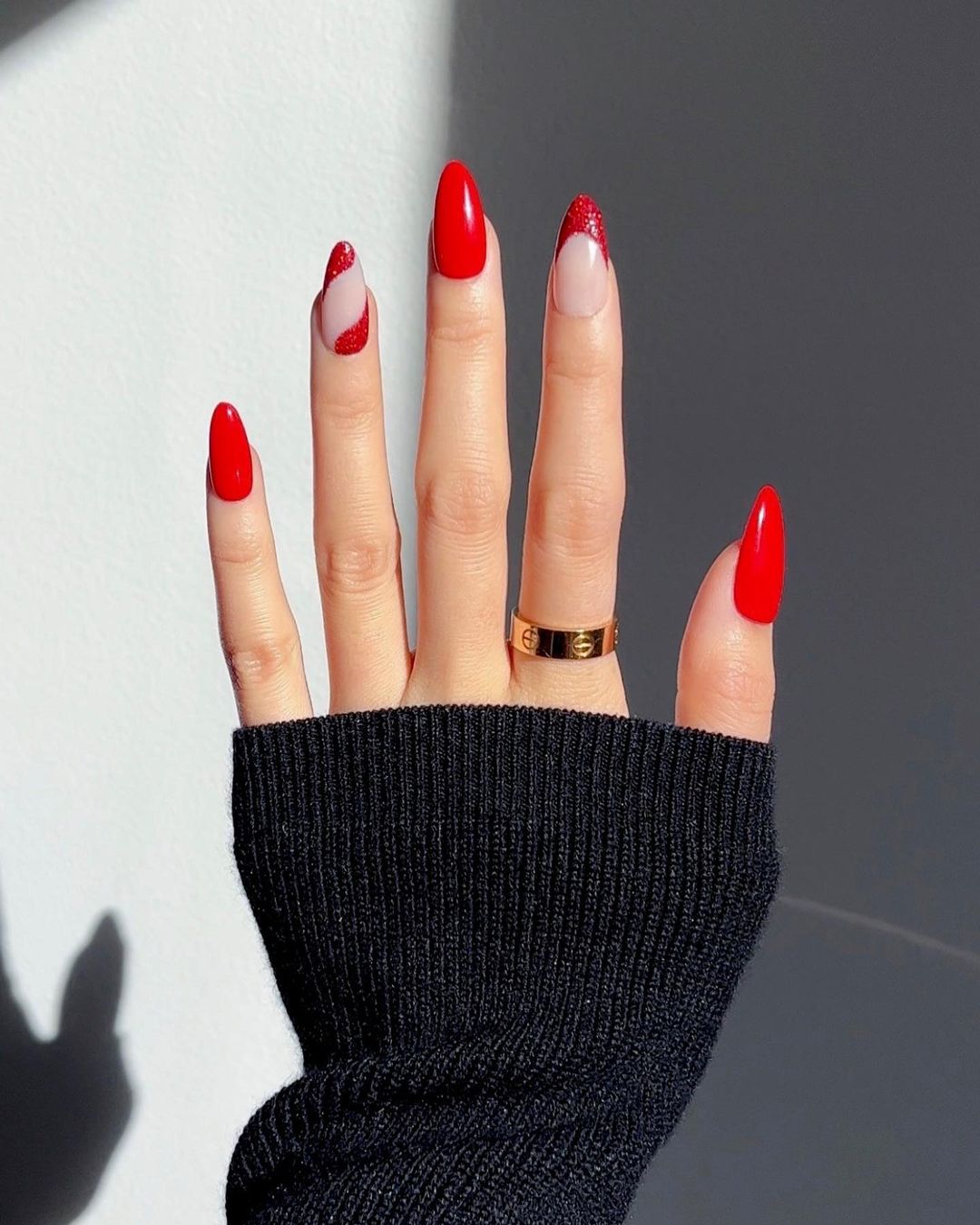 Можно украсить красный дизайн стразами, блестками или фольгой. Также, очень красиво и благородно будут смотреться длинные ноготки миндалевидной, овальной, квадратной или острой формы под матовым топом.