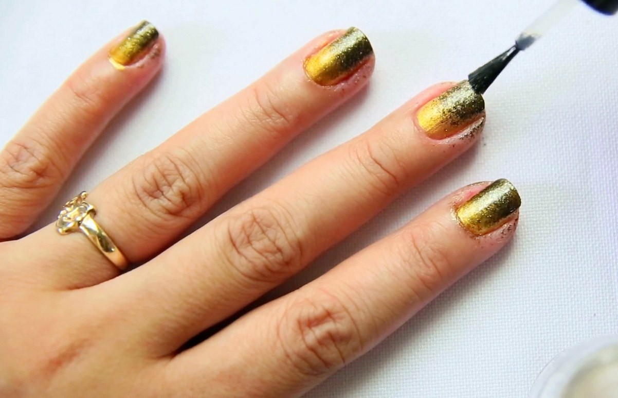 Излишки лака по краям и на пальцах оттирают ватной палочкой, смоченной в ацетоне или безацетоновом средстве. Дают лакам подсохнуть. Сверху на ногти наносят один-два слоя закрепляющего покрытия или обычного прозрачного лака. Он дополнительно размоет границу между тонами, придаст нужный эффект.