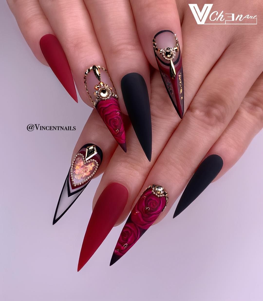 Для создания модного и стильного маникюра большинство мастеров используют уникальное сочетание черного и красного лака. Такой вариант дизайна невероятно красиво смотрится на длинной ногтевой пластине. Из-за длины маникюр приобретает визуальный объем. Например, красный фон покрыть матовым топом, а два ногтя покрасить в черный цвет и оставить в глянцевом дизайне. Самое главное в сочетании черного и красного — придерживаться умеренности и сдержанности. Нет необходимости использовать слишком много декоративных элементов. Ведь само сочетание насыщенных цветов имеет сложный и контрастный вид.