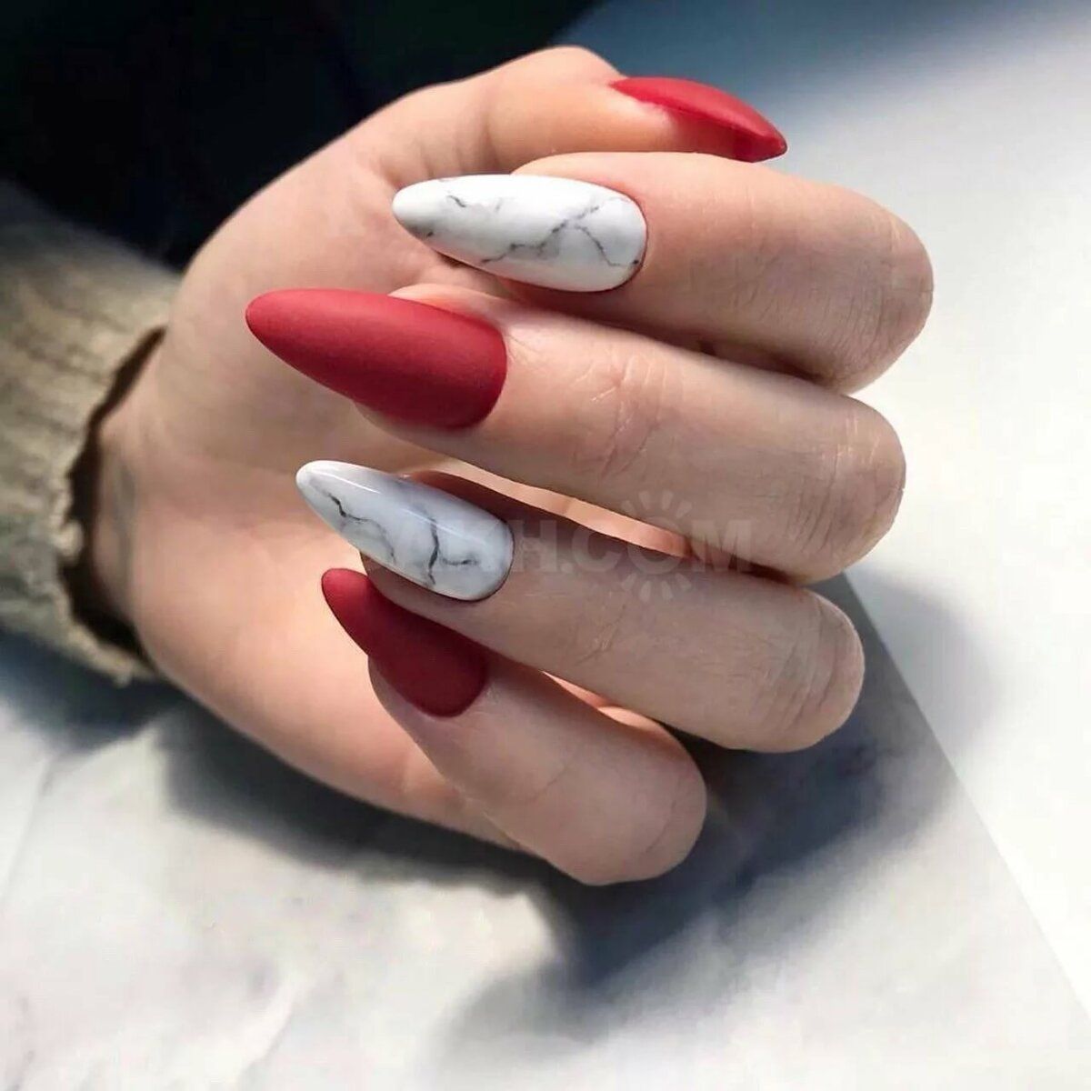 Первая новинка — это сочетание дизайна «разные руки» с матовым топом. Причем, одна рука как правило, должна быть красного цвета, а другая может быть — белого, синего, черного, зеленого, молочного, нюдового или любого другого цвета, который хорошо сочетается с тем оттенком красного, который нанесен на соседнюю руку. Выглядит такой дизайн очень оригинально и стильно.
