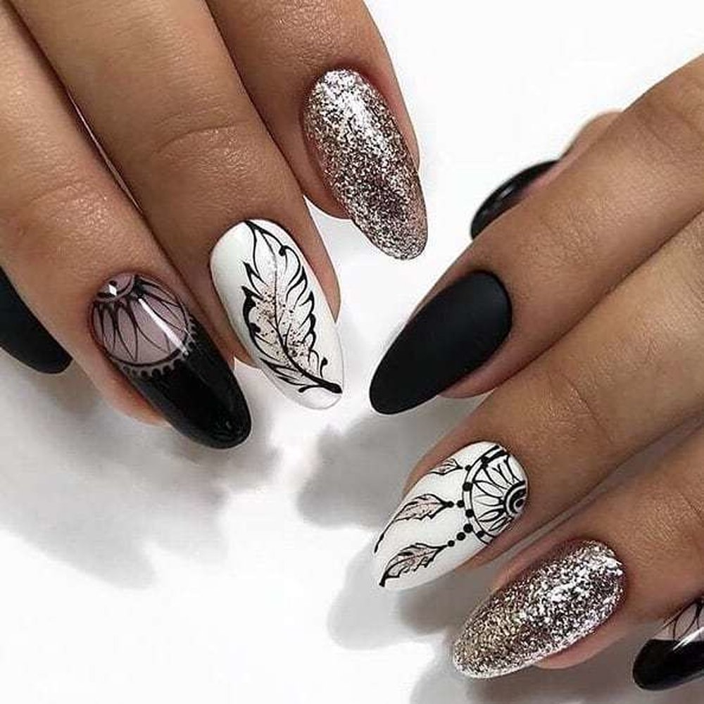 Стильно и эффектно будут смотреться длинные миндалевидные ноготки черного цвета, украшенные серебристыми блестками.