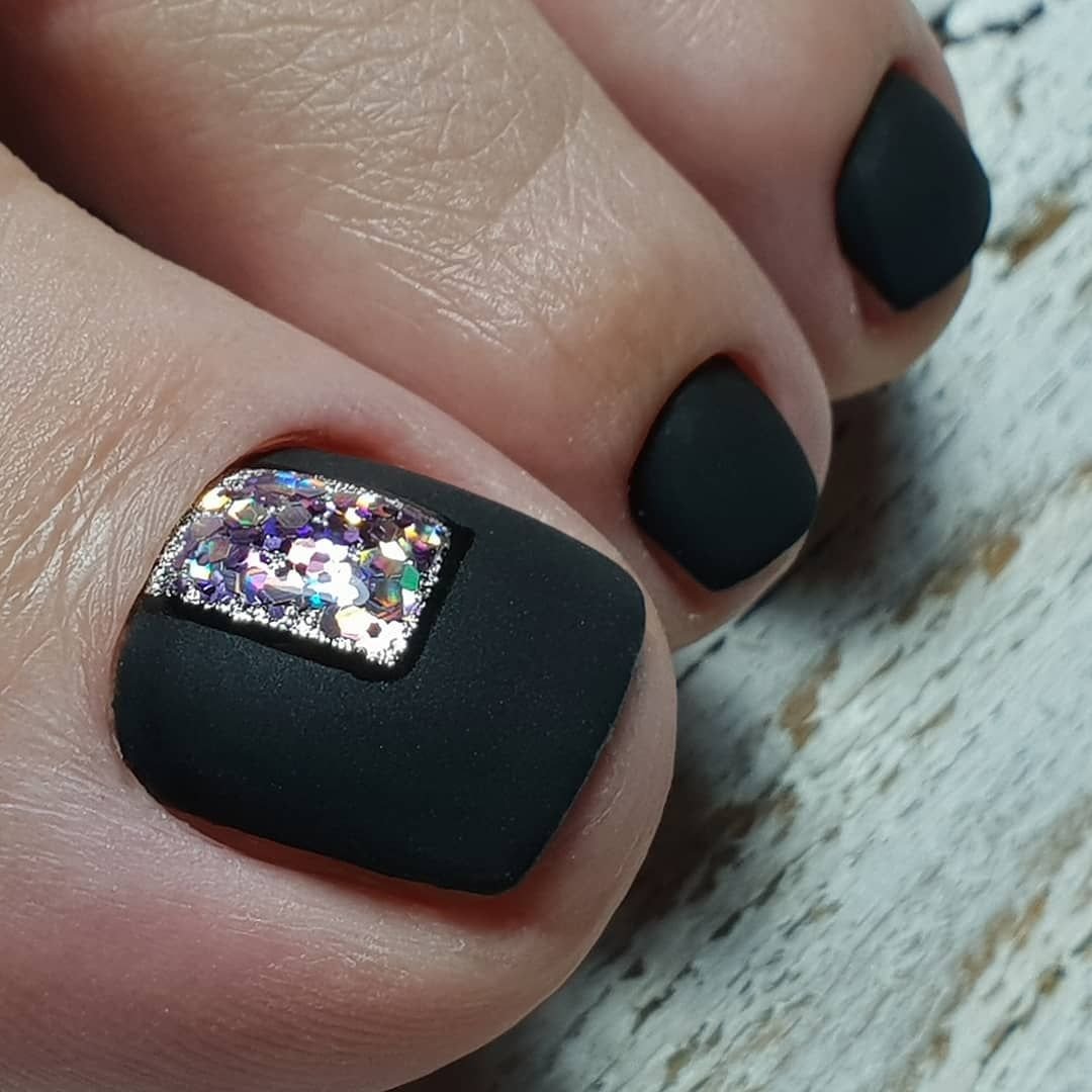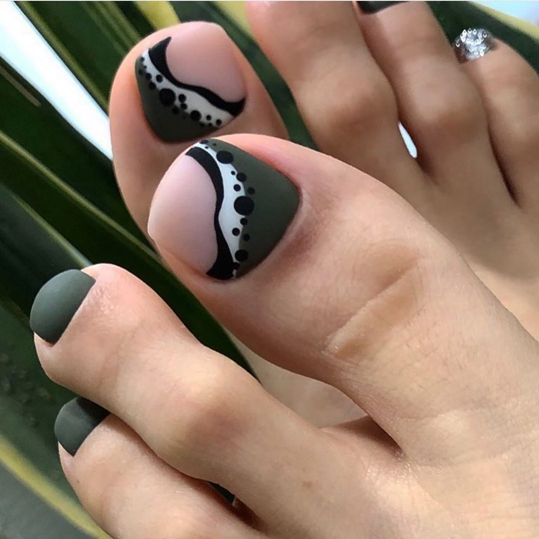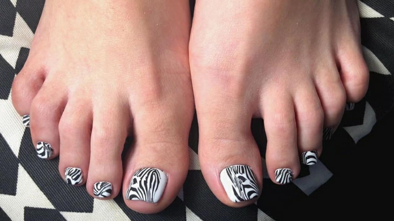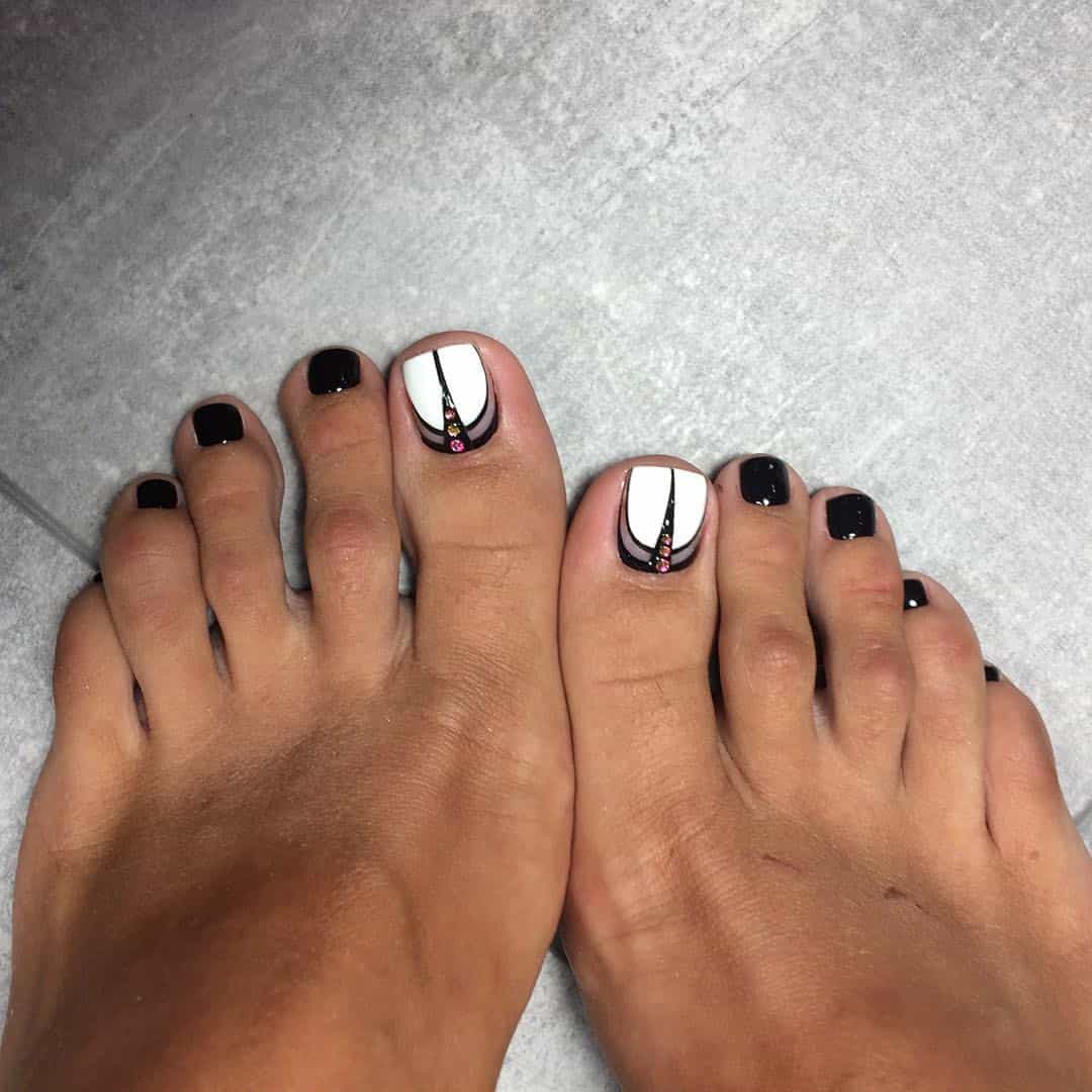 Белый и черный — два цвета, которые часто используются для создания необычных рисунков на ногтях на ногах. Черно-белый педикюр смотрится красиво, хотя он простой и лаконичный. Вы можете добавить черные точки, линии, цветы или надписи на белом полотне ногтя, чтобы придать экстравагантности.