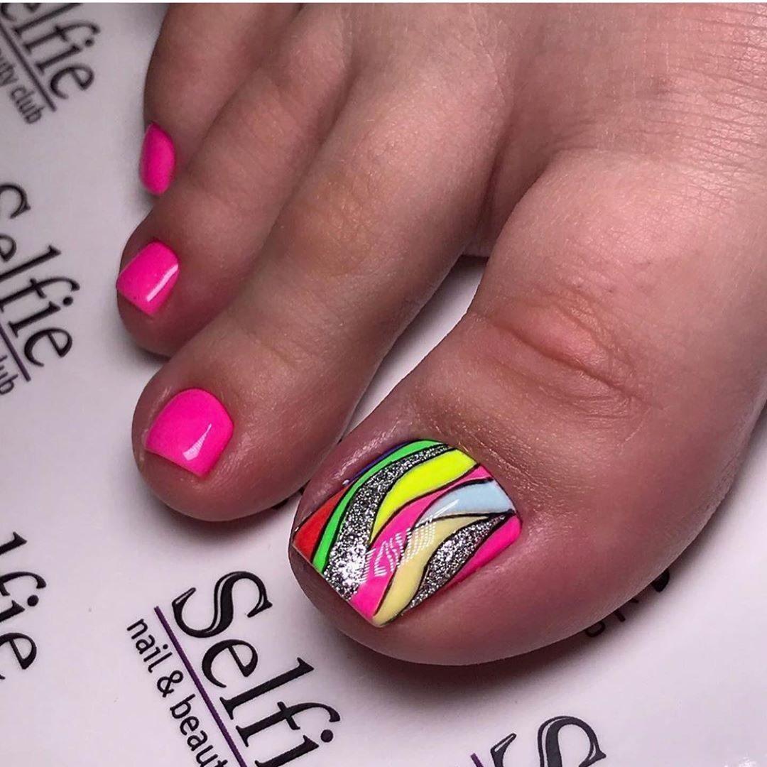 - Для любителей ярких цветов лучшим вариантом будет использование яркого педикюра, контрастного обуви и купальнику.