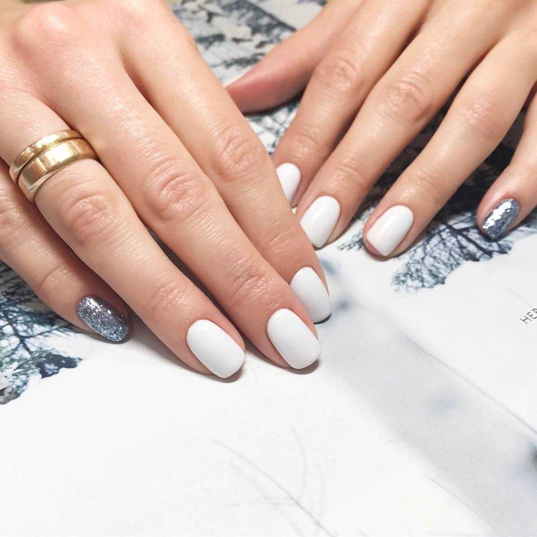 Белый полупрозрачный маникюр с серебряным глиттером на лунке словно напоминает о тающем снеге. Это очень нежный дизайн с градиентом, который особенно изящно смотрится именно на коротких ногтях.