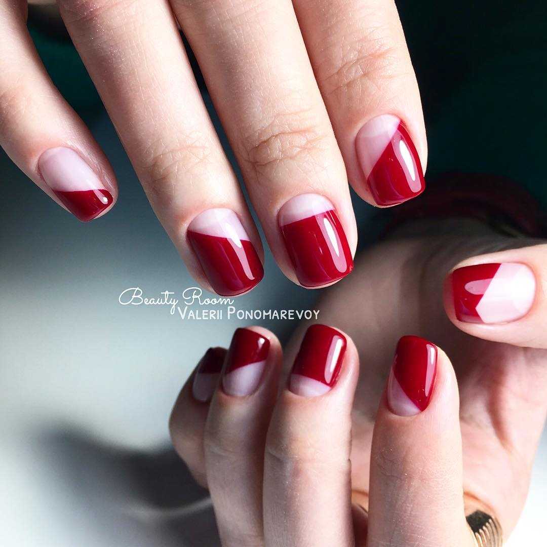 А если хочется, чтобы красные ногти были более сдержанными попробуйте комбинацию красного с матовым нюдовым покрытием. Можно сделать красный необычный френч.