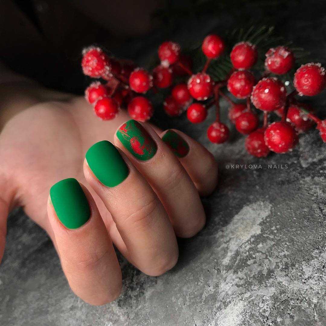 Глубокий зелёный маникюр интересно смотрится с матовым покрытием.
