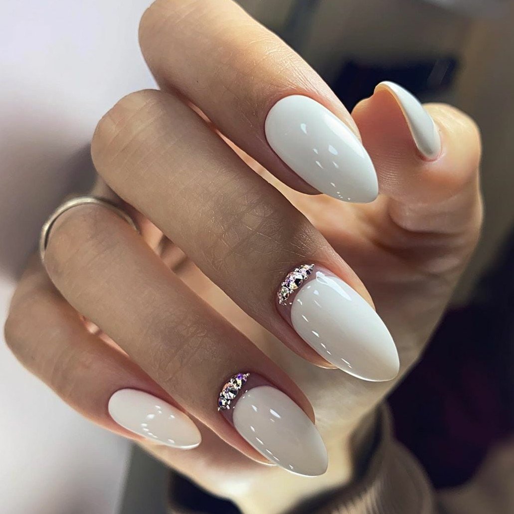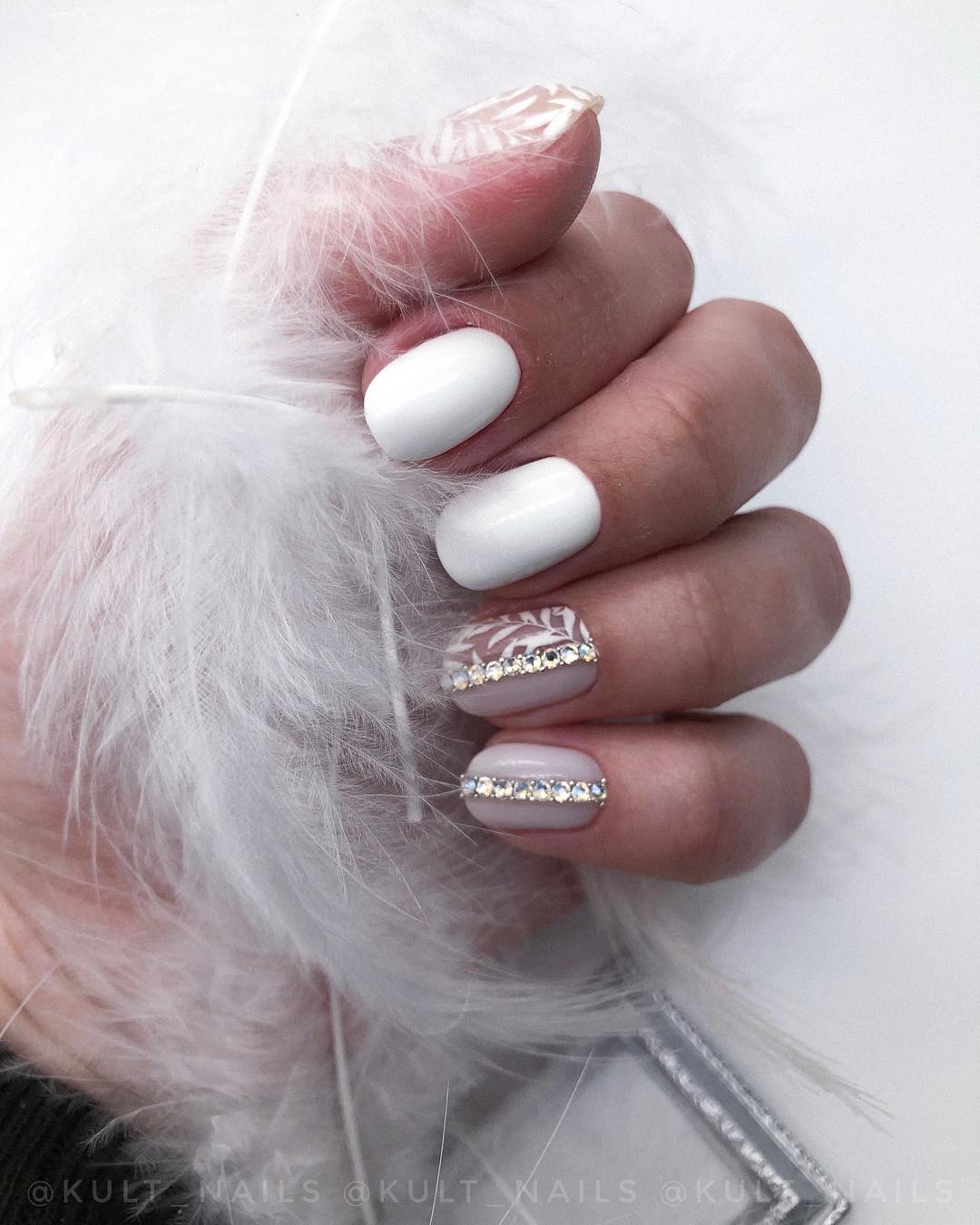 Работу с блестками и стразами в случае белого маникюра нельзя недооценивать. Именно эти элементы помогают разнообразить внешний вид и сделать его нескучным.