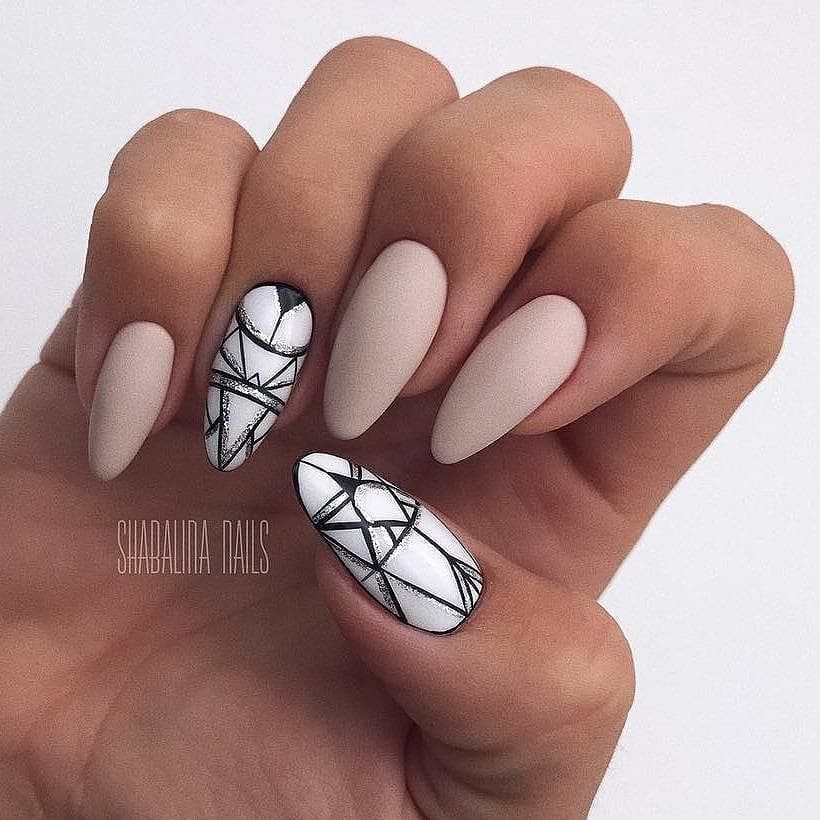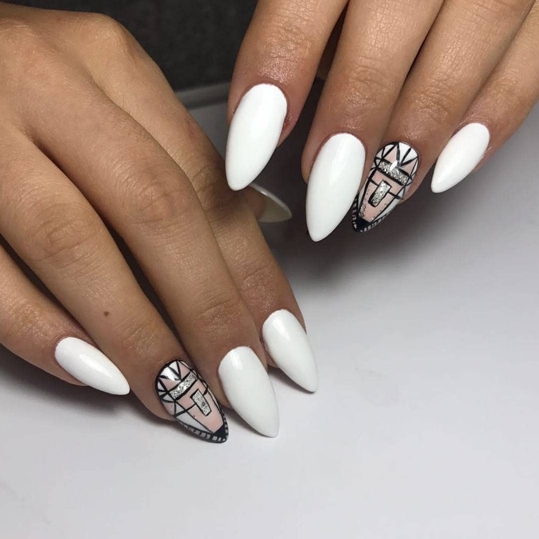 Сочетание белого лака с черным также имеет своеобразную изюминку. Ноготь может быть разделен на несколько секторов или содержать вкрапления черного, врывающегося в белоснежную гладь.