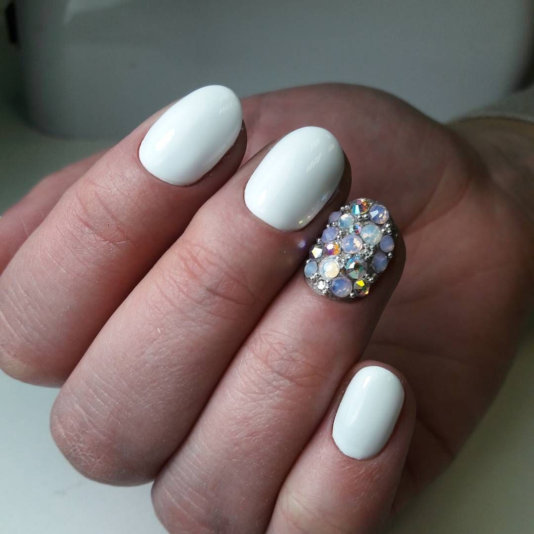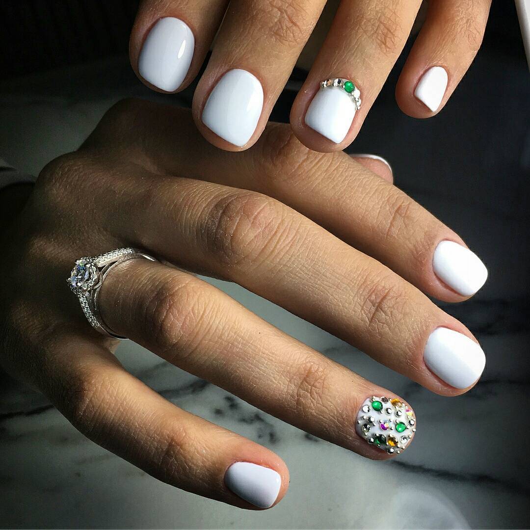 Вы можете оставить белый маникюр без дополнительных декоративных элементов или добавить дизайн на свой вкус. Вы можете использовать наклейки, камни, блестки, рису