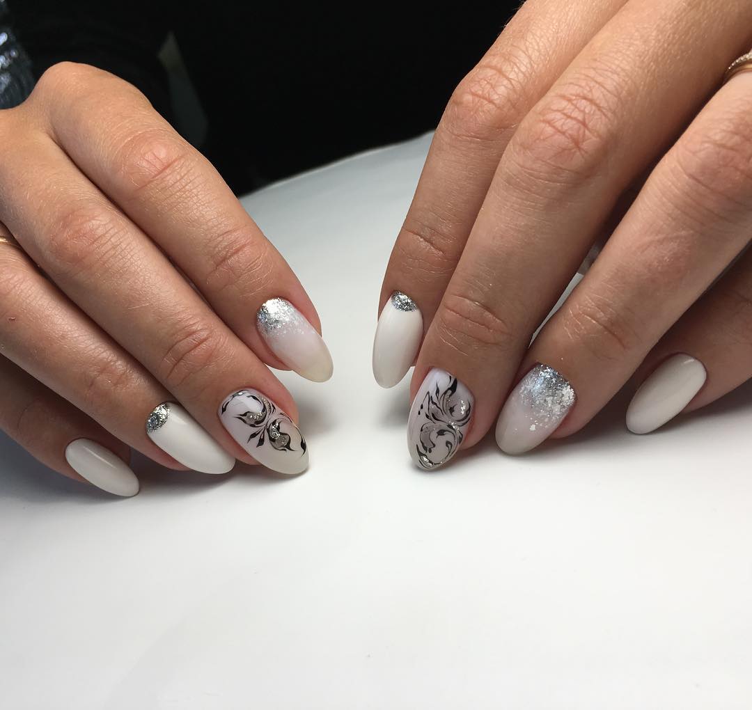 В предстоящем году в тренде будет белый маникюр, украшенный разного рода блеском, светящийся и переливающийся. Вариантов его оформления не счесть. Ведь каждая женщина представляет себе идеальный маникюр по-своему. А если вы делаете его самостоятельно, то подобного узора не будет нигде в мире.