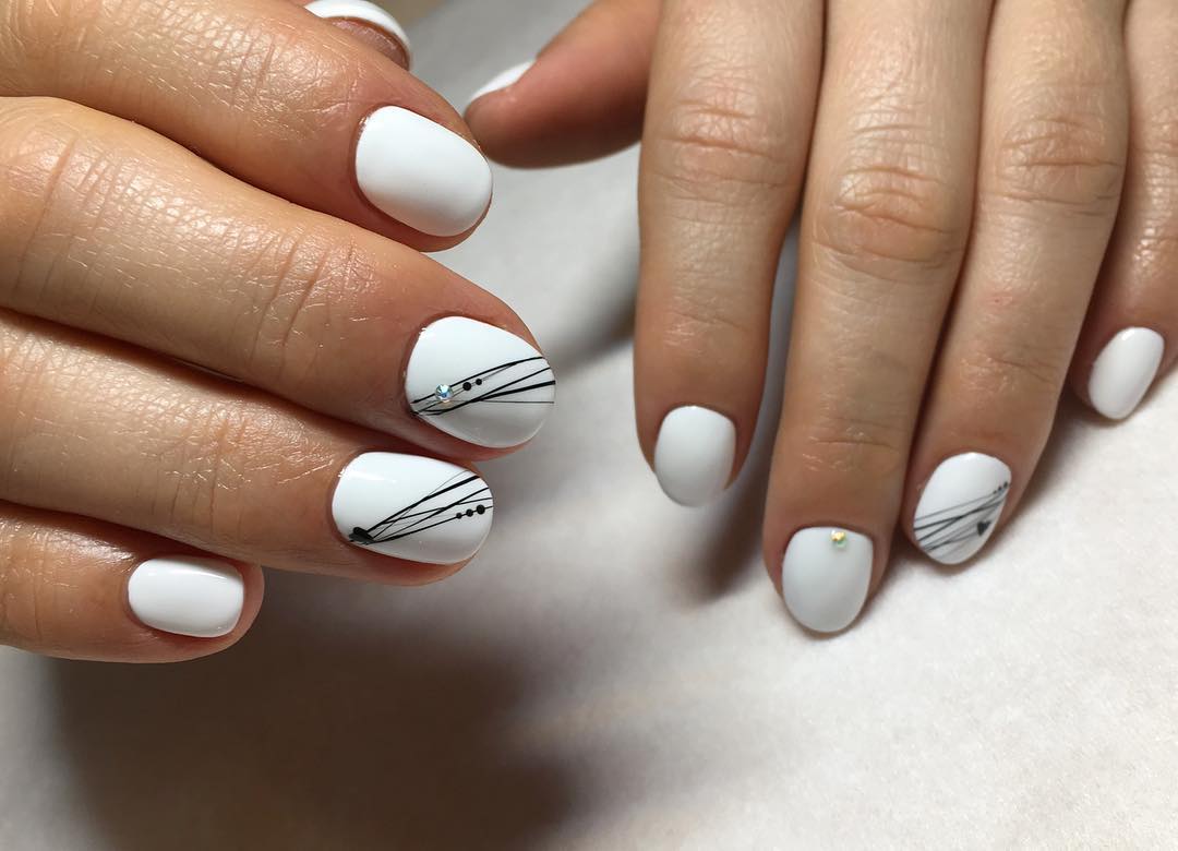 Белые короткие ногти тоже могут выглядеть красиво, если правильно подобрать маникюр. Необходимо соблюдать одно правило коротких ногтей — соразмерный узор. Если вы решили украсить ноготки стразами или рисунком, они не должны быть аляпистыми. Аккуратный узор на белом фоне — отличное решение для коротких ногтей. Некрупные элементы, камешки, различные линии. Стоит, однако, избегать горизонтальных полос, они сделают ноготь визуально короче.