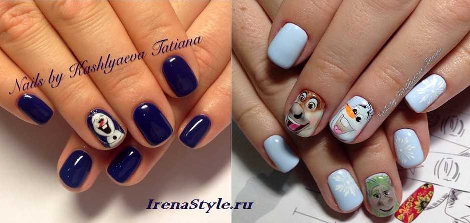 Сегодня самым популярным маникюром со снеговиком считается рисунок из мультфильма «Холодное сердце». Особенно актуальностью такой дизайн пользуется у подростков и молодежи. Маникюр со снеговиком Олафом отлично дополнит новогодний наряд, тематический костюм или повседневный образ в молодежном стиле. Вероятно, сегодня все смотрели «Холодное сердце» и знают снеговика по имени Олаф, как веселого, задорного и неунывающего. Добавить нотку позитива в свой образ – идеальное решение в праздничном образе.