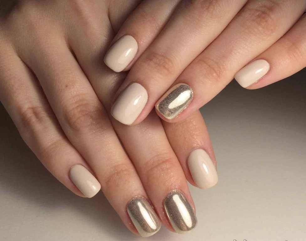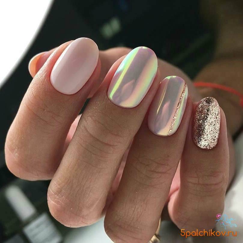 Жемчужно-перламутровая втирка позволяют создать невесомо-нежный, романтичный образ. Она самодостаточна и не нуждается в дополнительном декорировании. Если все же хочется разнообразия, делают акцент на единственный ноготок, в виде блесток или стразов.